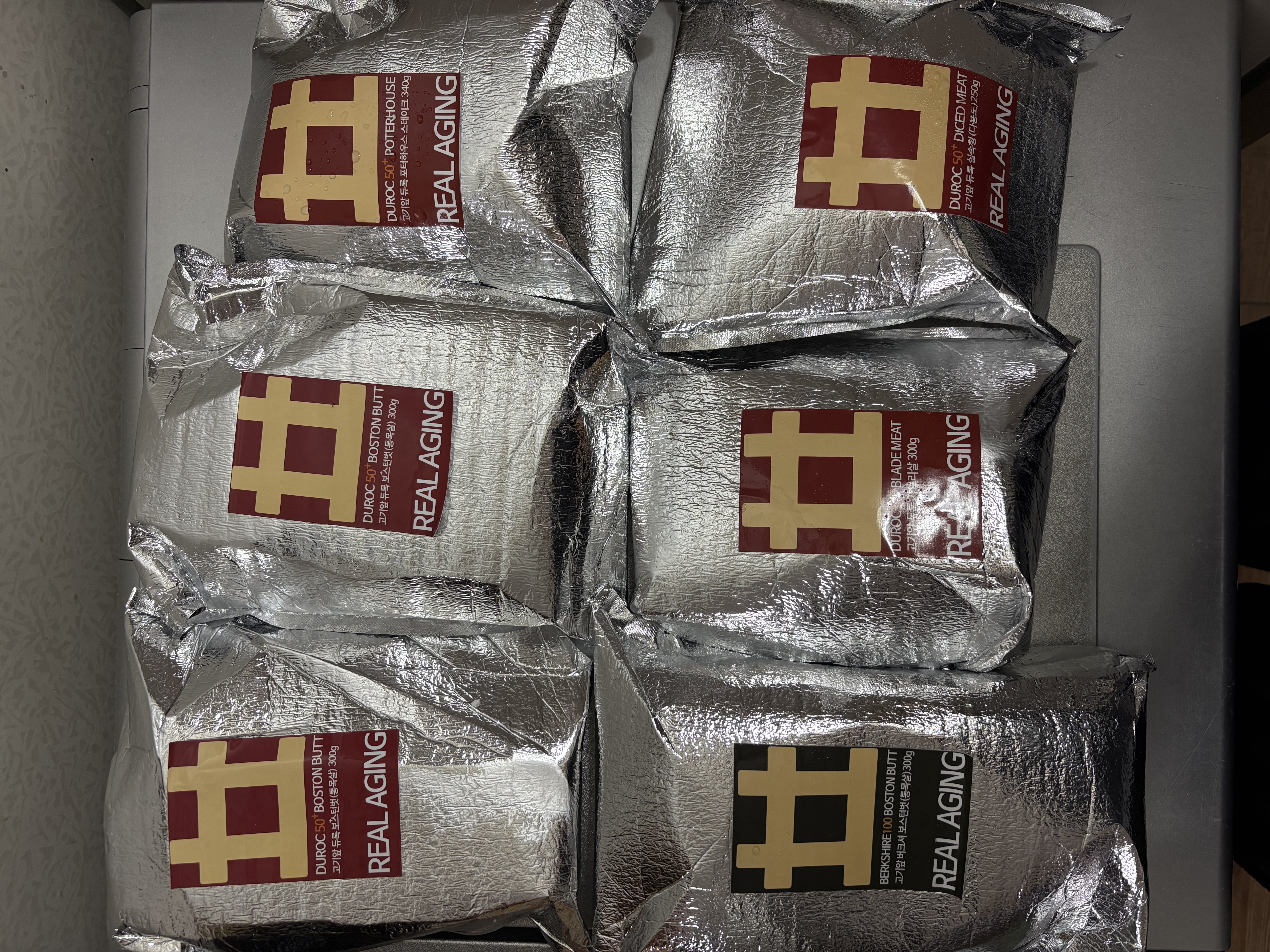 택배 잘 받았습니다. 냉동제품이라 그런건가요? 그건 아닌 것 같고.. 고기에 검은 색이 정상인지 문의드립니다