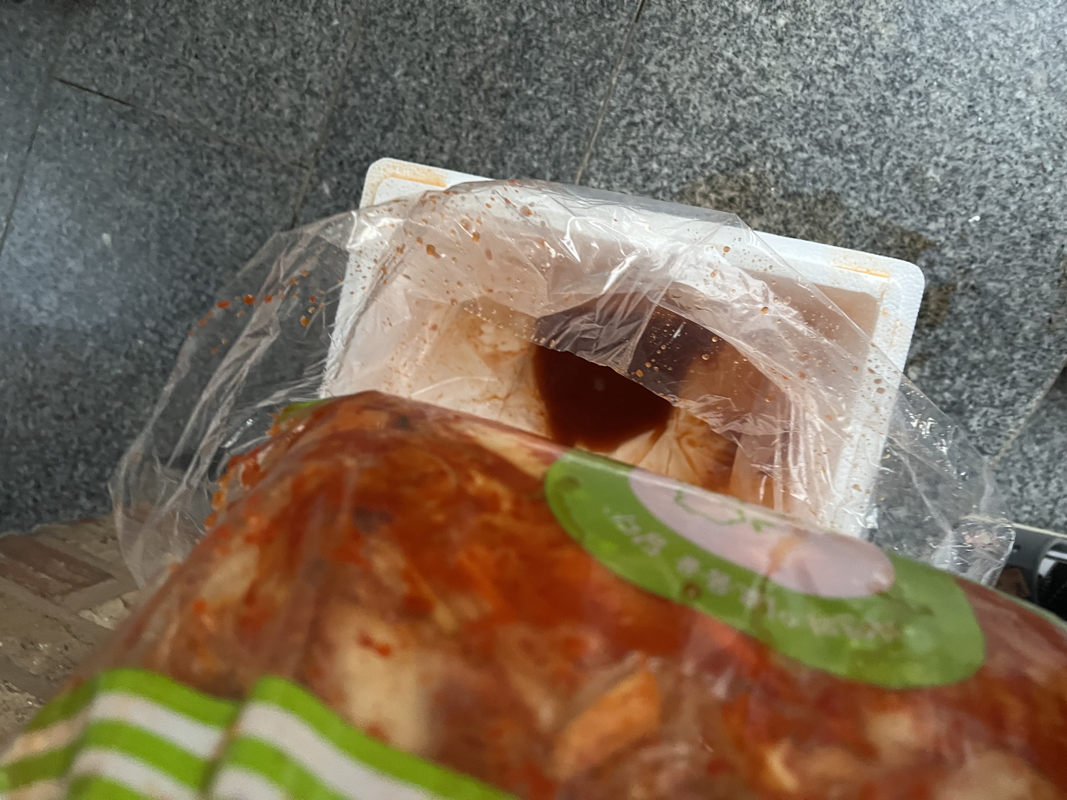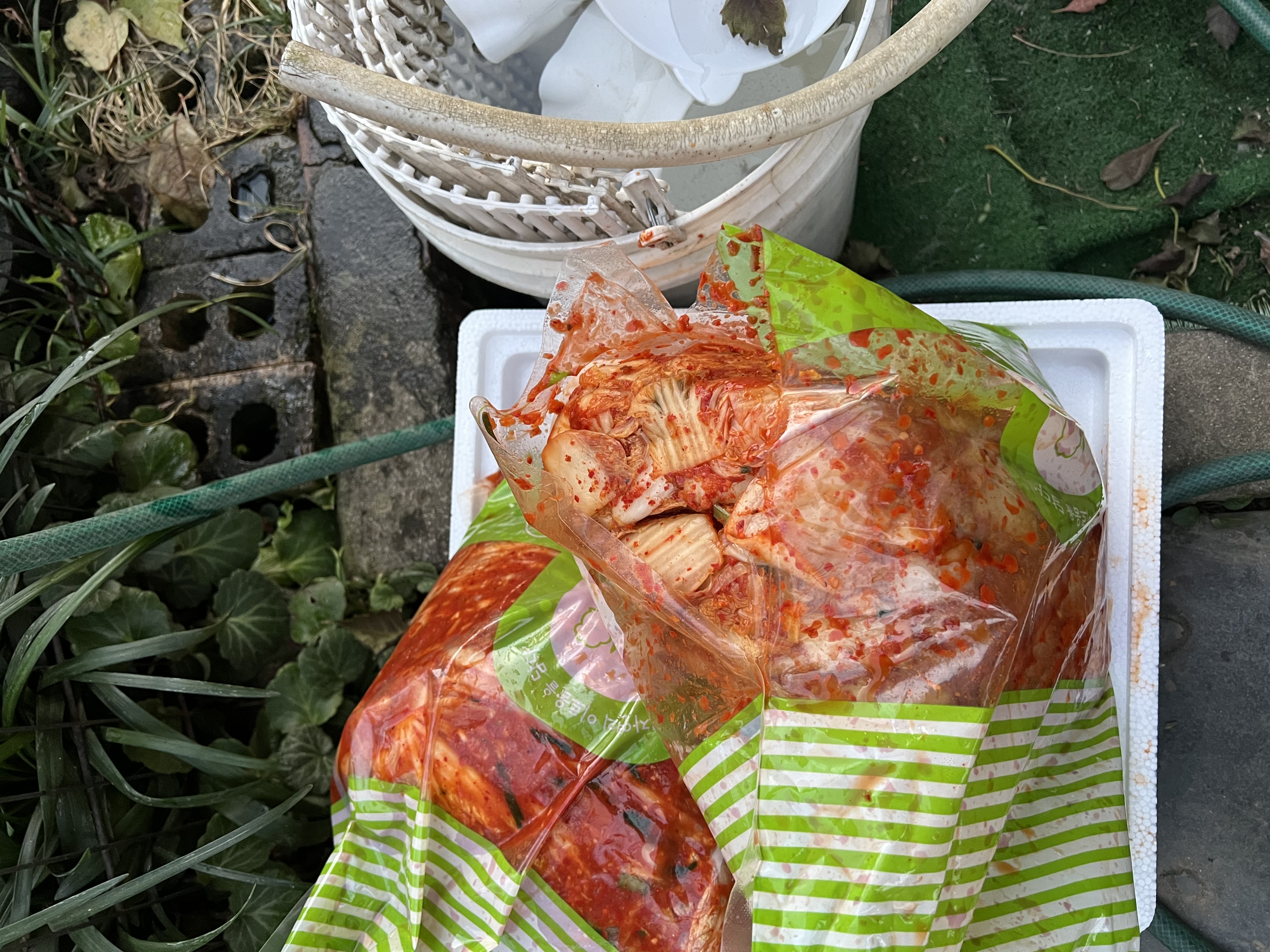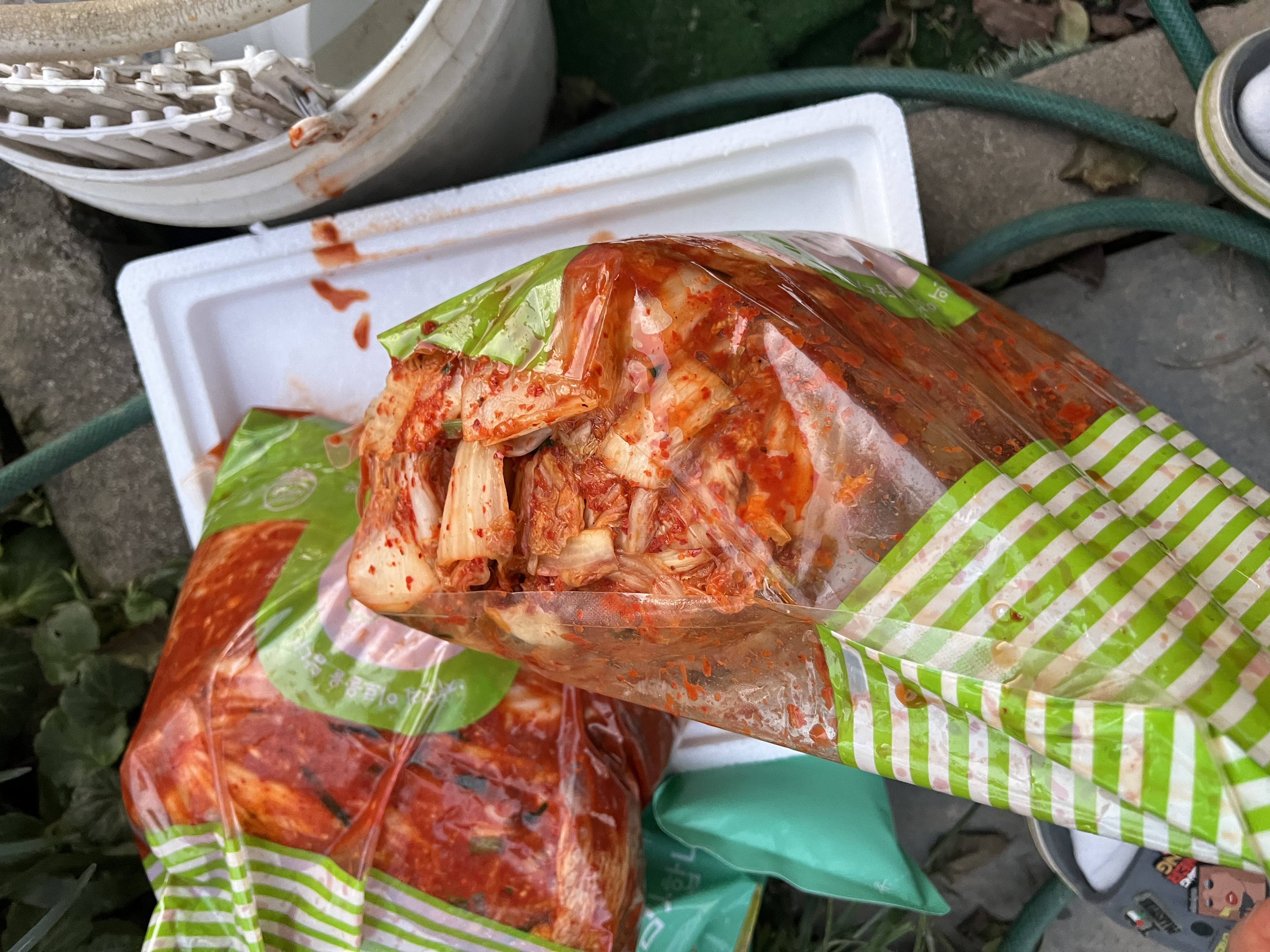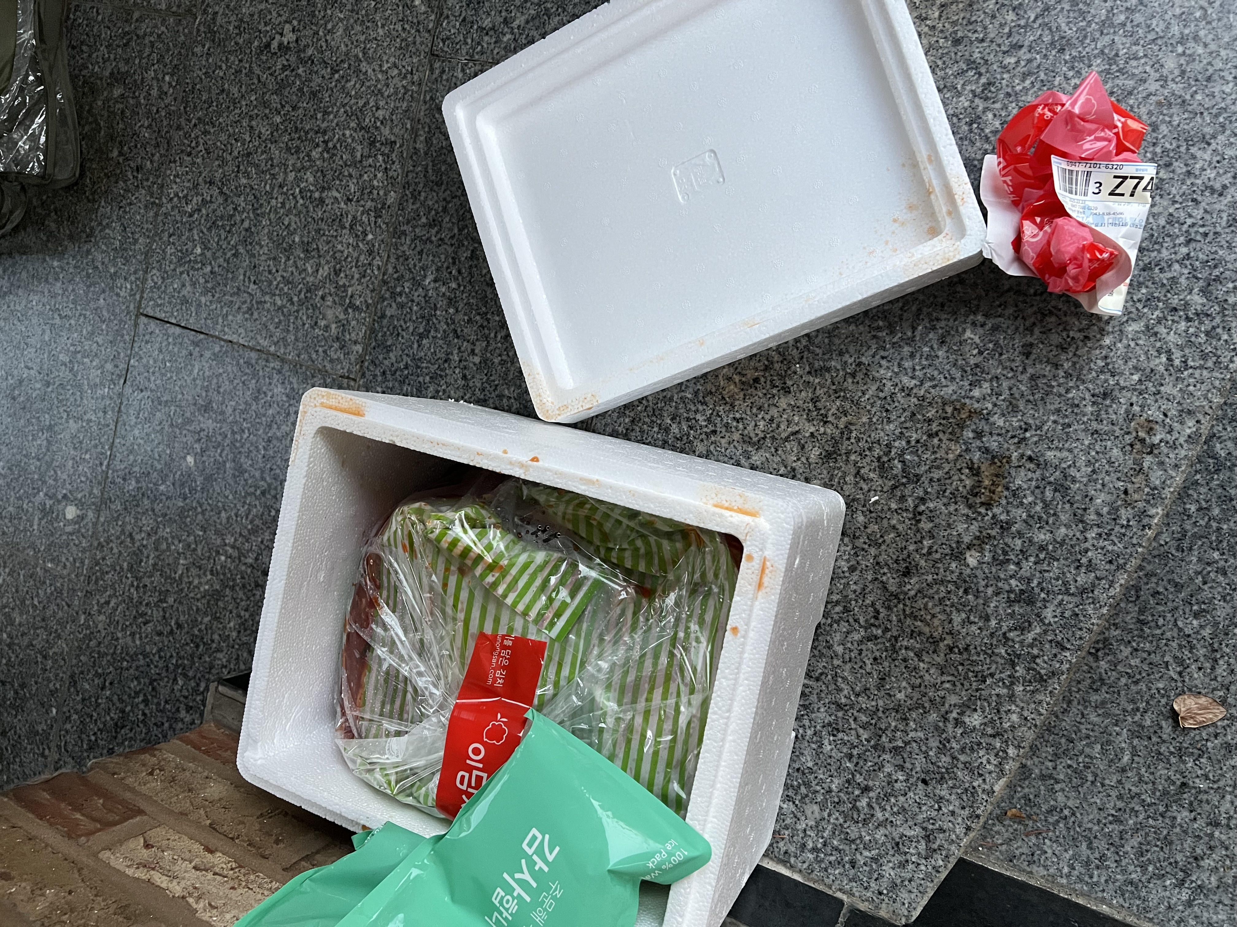 박스 겉으로 김치국물이 흘러 열어 보니 김치 포장이 터져 새어 나왔습니다.