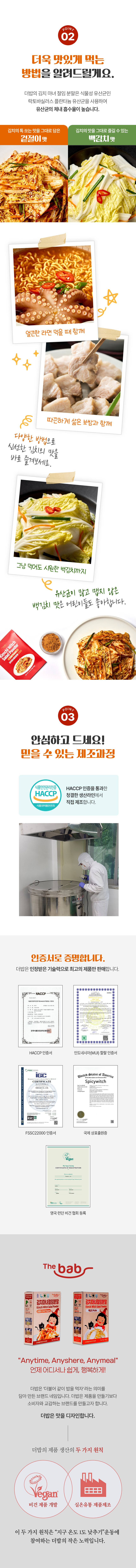 이번에 출시된 제품 모두 비건, 할랄 인증 제품이다. 비건은 육류를 포함한 동물 유래 제품도 섭취하지 않는 자를 뜻하며 할랄은 이슬람 식품 규정에 따라 제조되고 허용된 음식과 음료이다. 한국 식품에서는 아직 비건이나 할랄 인증을 받은 제품이 드물다. 이 때문에 한국의 맛을 경험하고 싶어도 하지 못하는 외국인들도 꽤 있다고 한다. 그렇지만 이번 기회에 사람들이 직접 간편하게 만들고 한국의 맛을 경험할 수 있는 제품을 만든 더밥에게 박수를 보낸다.