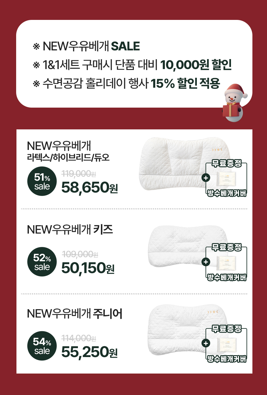 다음은 NEW 우유베개 시리즈다. 약간 둥그런 탄탄하게 경추를 받쳐주는데, 종류에 따라 푹신한 정도가 다르더라. 살짝 다른 게 아니라 본인은 확연히 다르게 느껴졌다. 가장 탄탄한 듀오는 경추를 약간 마사지 해주는 기분도 느껴졌다.