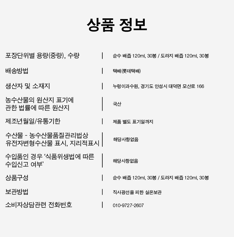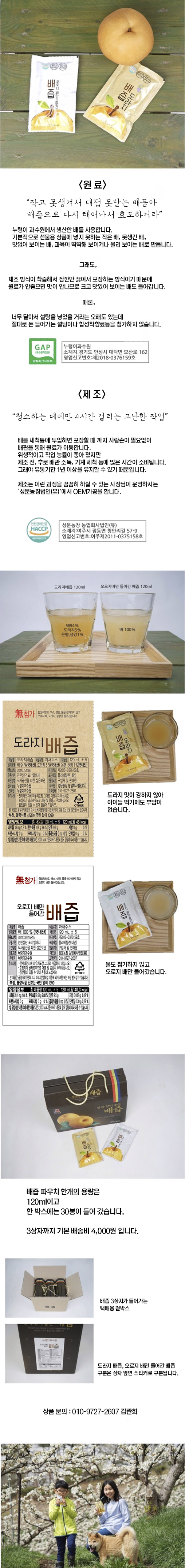 많은 분들에게 꾸준한 사랑을 받아온 ‘누렁이 과수원 배’가 드디어 즙으로 나왔다. 이미 ‘선물용 배’와 ‘가정용 배’가 후기를 통해 많은 구매자들에게 인정받았으니 배즙도 우리를 크게 실망시키지 않으리라 예상되지만. 그래도, 할 일은 해야지.