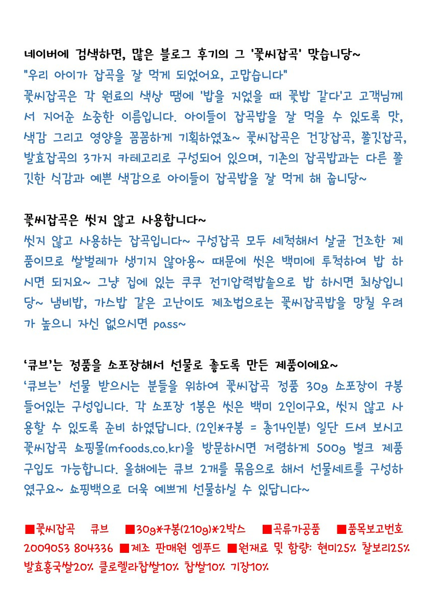 만약 앞서말한 것처럼 ‘잘 먹는 것’이 ‘잘 사는 것’과 연결지어져 있다면, 그리고 이 특별한 잡곡들이 그렇게 밥 잘 먹으며 잘 사는 데에 도움이 된다면, ‘이거 한 번 드셔보시라’고 권하지 않을 이유가 무엇일까? 간편하고 맛있는 잡곡으로 지은 밥 먹으면서 우리도 한 번 잘 먹고 잘 살아보자.