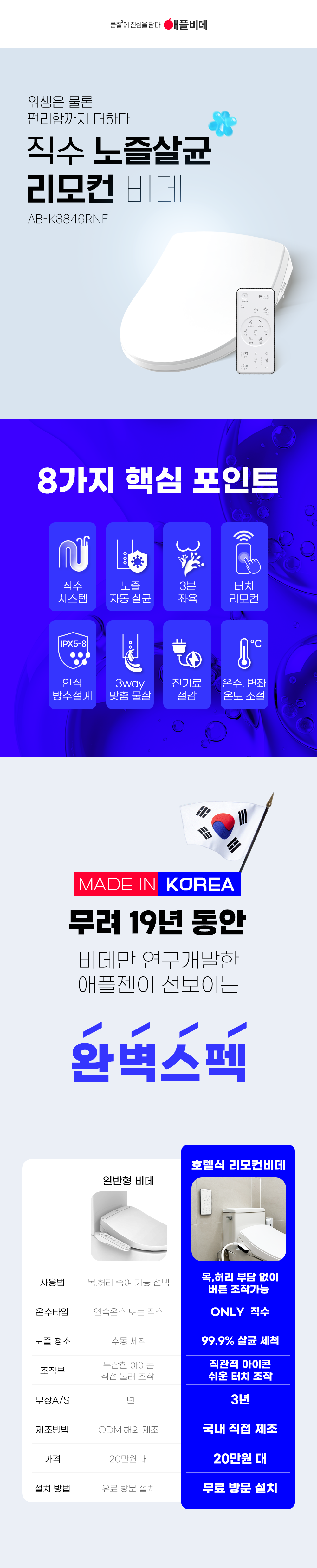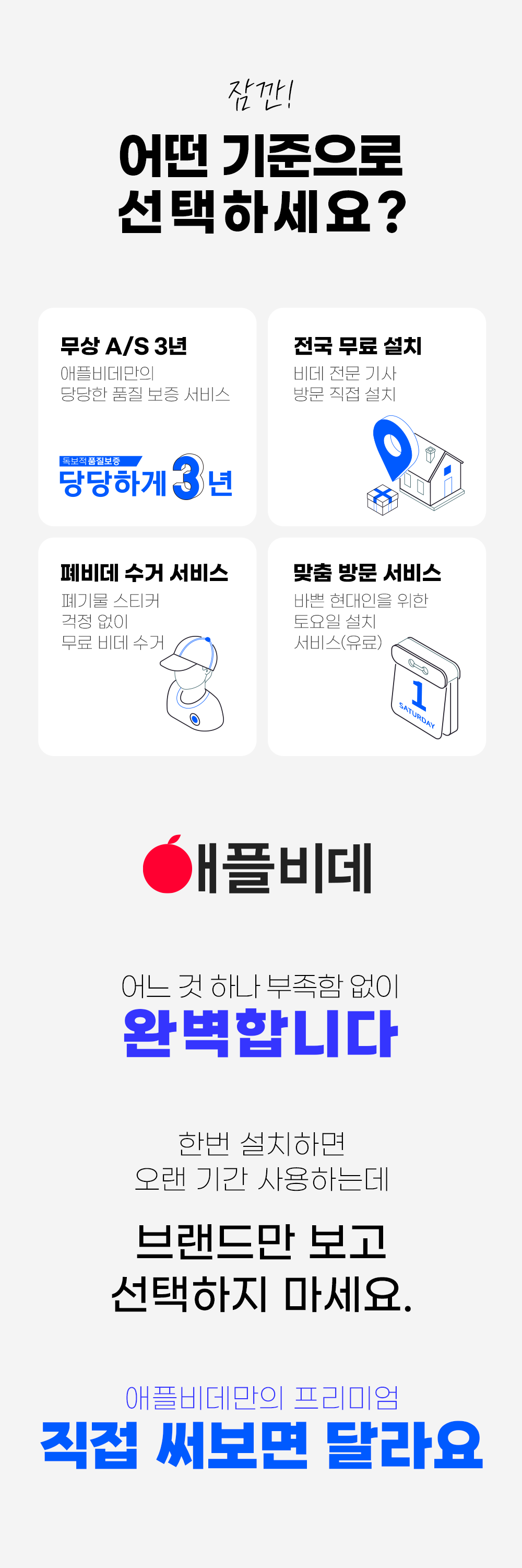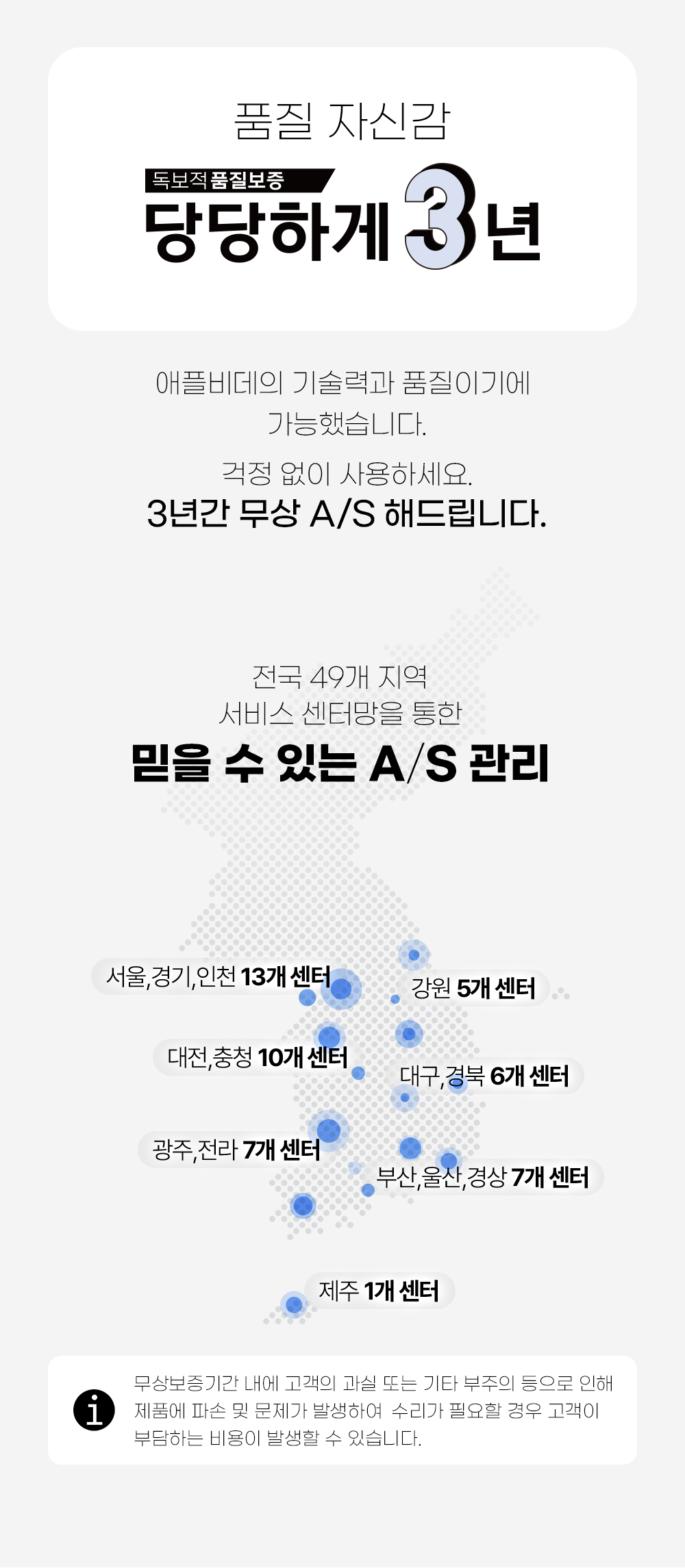 다른 업체의 A/S 기간을 살펴보면, A/S 기간이 1년이거나 기간 표기가 없는 곳이 많다. 그런데 애플 비데는 과감히 3년 무상 A/S를 내질렀다. 이것이 무슨 말이냐 하면, 앵간해선 3년 안에 망가질 일이 없다는 거다. 생각해 봐라, 고장이 잦은데 3년 무상 A/S를 내지르면 회사가 손해 보는 건 당연한 거 아닌가. 그런데! 애플 비데는 무상 A/S 기간을 3년으로 했다는 건, 다시 말해 자신 있다는 거다.