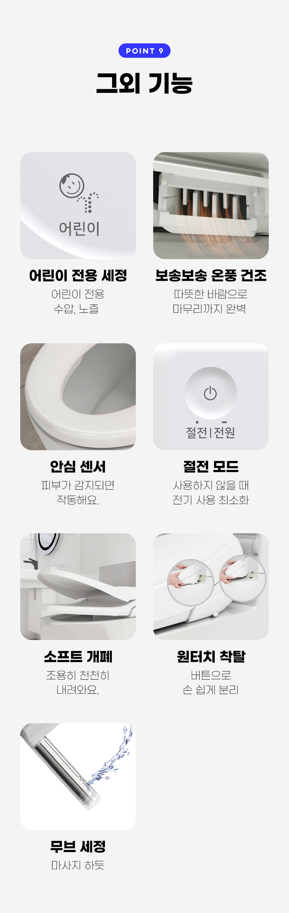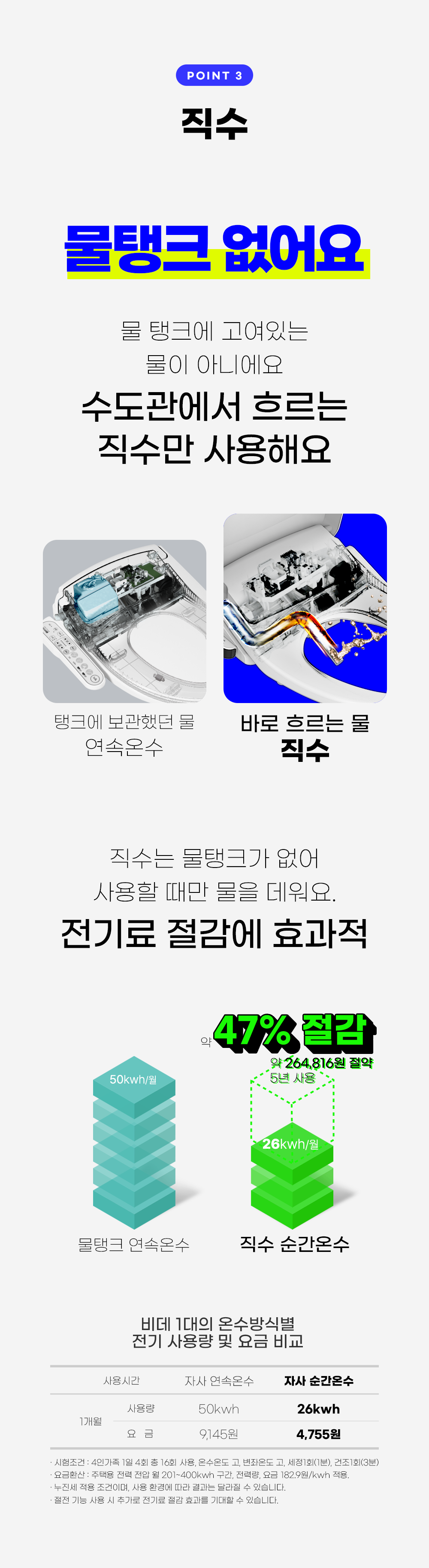 물탱크를 계속 가열해 온수를 뽑아내는 게 아닌지라 전기가 절약된다. 일반 연속 온수 비데보다 무려 47%의 전기 절약 효과를 보인다니 기쁘지 아니할 수 없다.