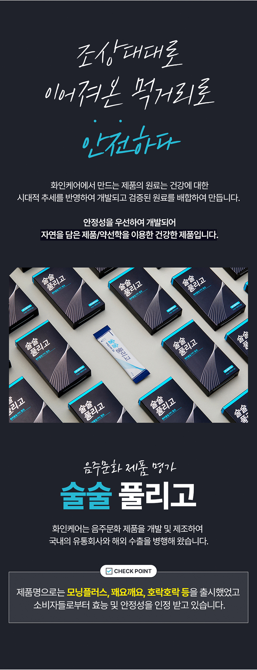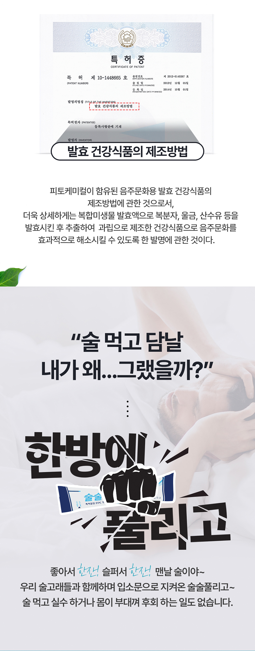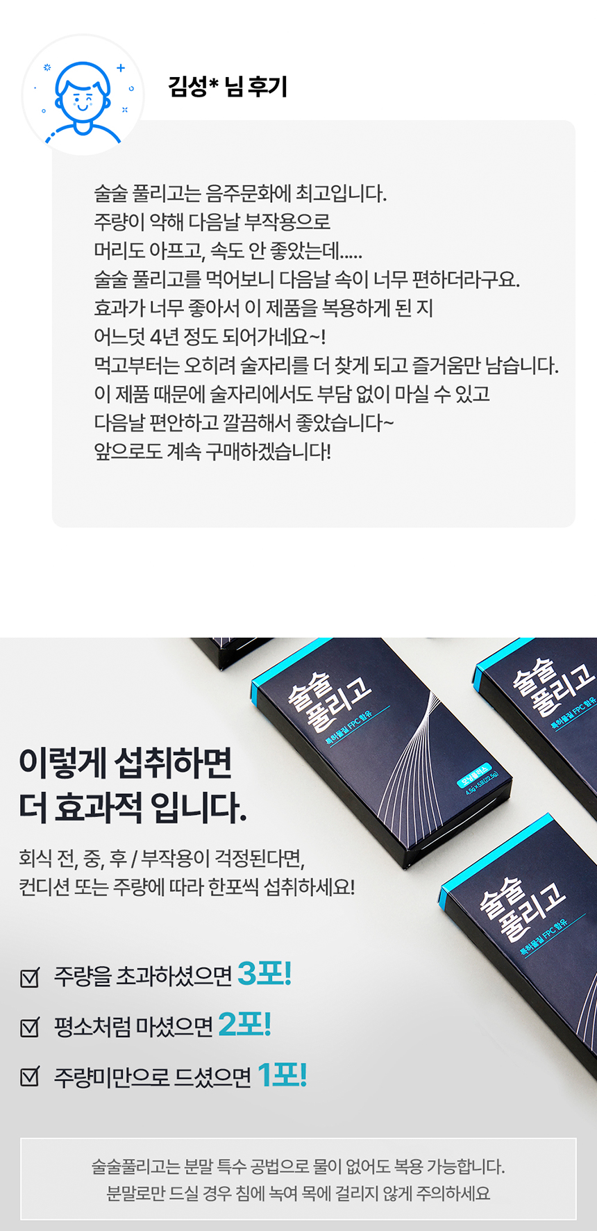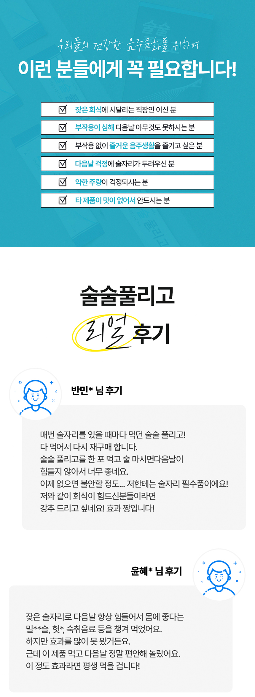 대조군도 적고 음주 전후 검사를 한 게 아니라 모든 사람에게 추천하기는 어렵지만, 본인 정말 다양한 숙취해소제를 먹어보았는데, 술술풀리고 만큼 괜찮았던 제품은 아주아주 드물었다고 말할 수 있다. 하지만 개인적으로는 숙취가 걱정인 분께 추천드리고 싶다. 술술풀리고 이름만큼이나 술술 풀리니 말이다.