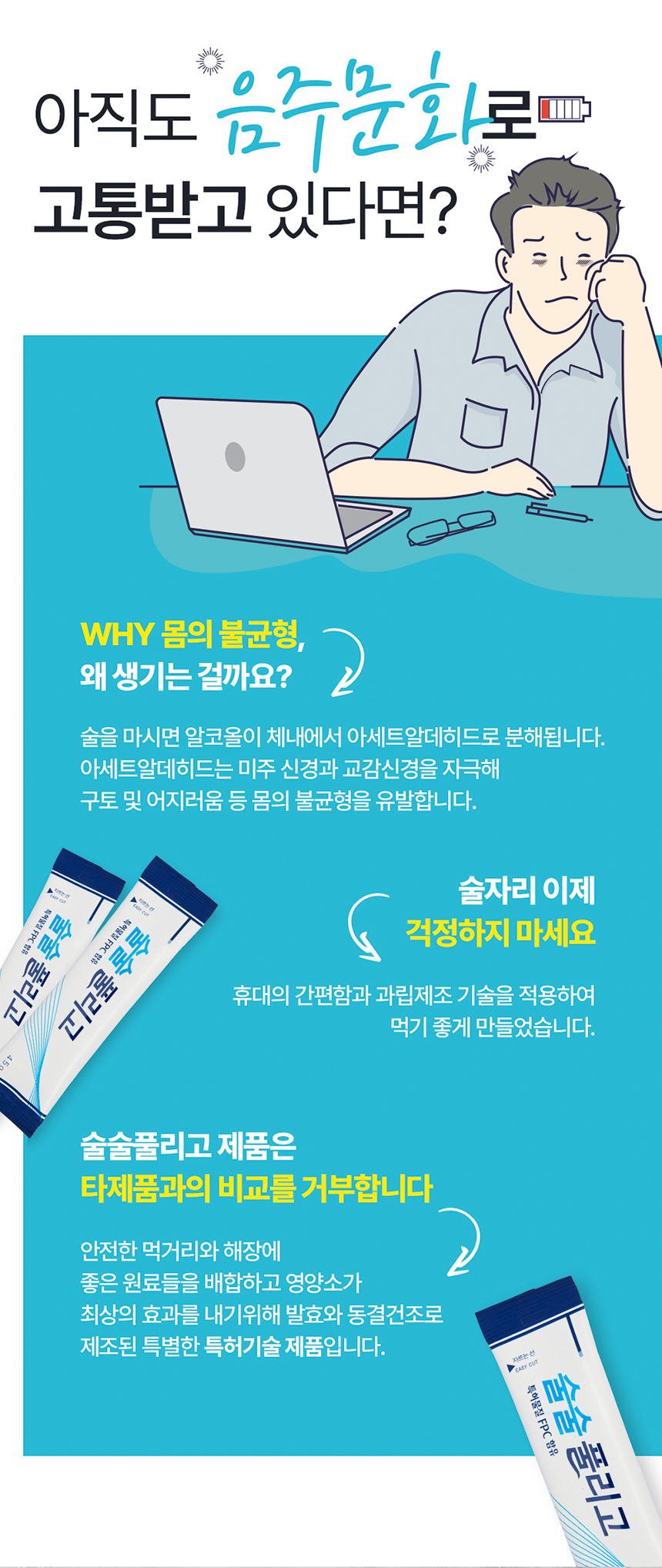 술술풀리고를 보고 잠시 옛날 생각이 났다. 술을 못해도 일주일에 한 번은 마셨던 때. 이제는 한 달에 한 번 술을 마실까 말까 하지만 당시 꽤 많이 마셨더랬다. 그렇다 보니 안 마셔본 숙취해소제가 없을 정도였다. 하지만 요새는 술 마실 일도 적어 숙취해소제인 술술풀리고를 보자 문득 옛 생각이 난 것이다. 왜 음주 횟수가 줄었나. 이유는 다름 아닌 주변 환경 때문이다.
