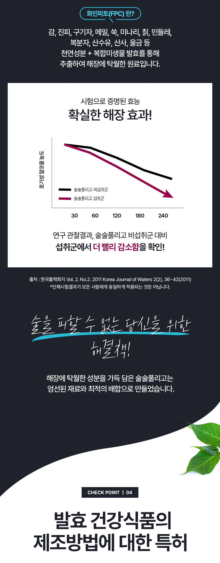 다음날이 되니 생각보다 더 개운하더라. 평소 마시던 주량대로 마셔도 다음날은 보통 숙취가 있기 마련인데, 확실히 숙취 자체가 많이 없었다. 다만, 술을 마실 때는 술이 깬다는 느낌은 적었다. 다른 사람들도 비슷한 느낌을 받은 듯 하였다. 화인피토가 특허 물질이라는데, 이것 때문인지 다른 이유 때문인지는 모르겠으나 숙취만큼은 확실히 줄더라.