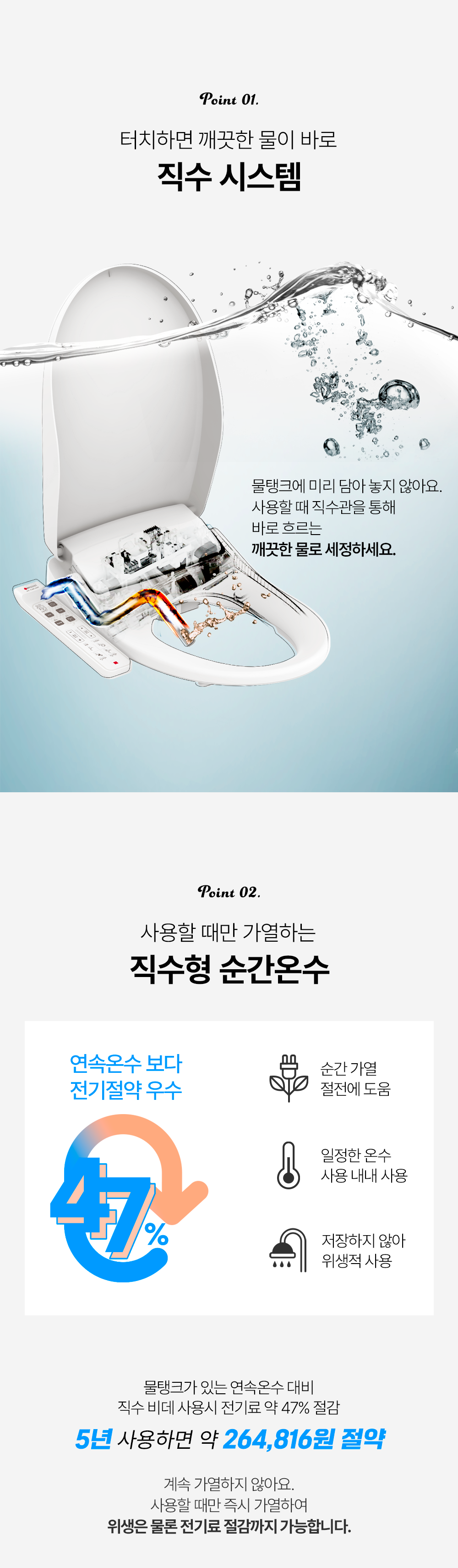 물탱크를 계속 가열해 온수를 뽑아내는 게 아닌지라 전기가 절약된다. 일반 연속 온수 비데보다 무려 47%의 전기 절약 효과를 보인다니 기쁘지 아니할 수 없다.
