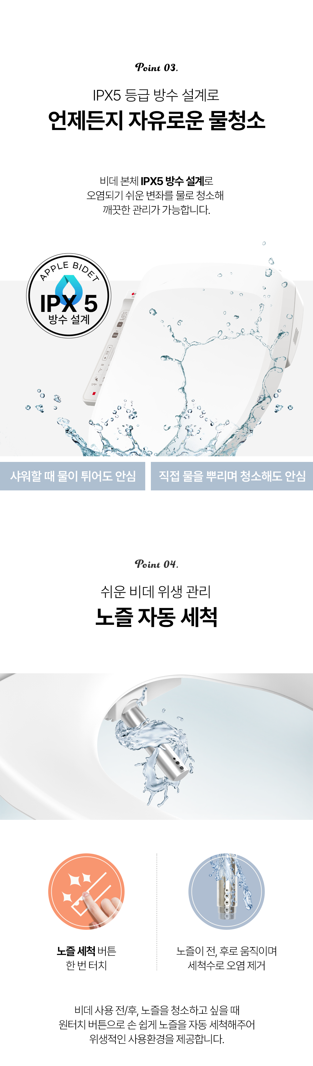 애플 비데는 우레탄 몰딩 방식이라고 해서 조작부를 우레탄에 완전 잠기는 방식으로 제작해, 완벽에 가까운 방수를 자랑한다고 한다. 게다가 외부 유격이 없는 터치식이라 외부 유격이 있는 버튼식보다 훨 방수가 잘되도록 했단다.