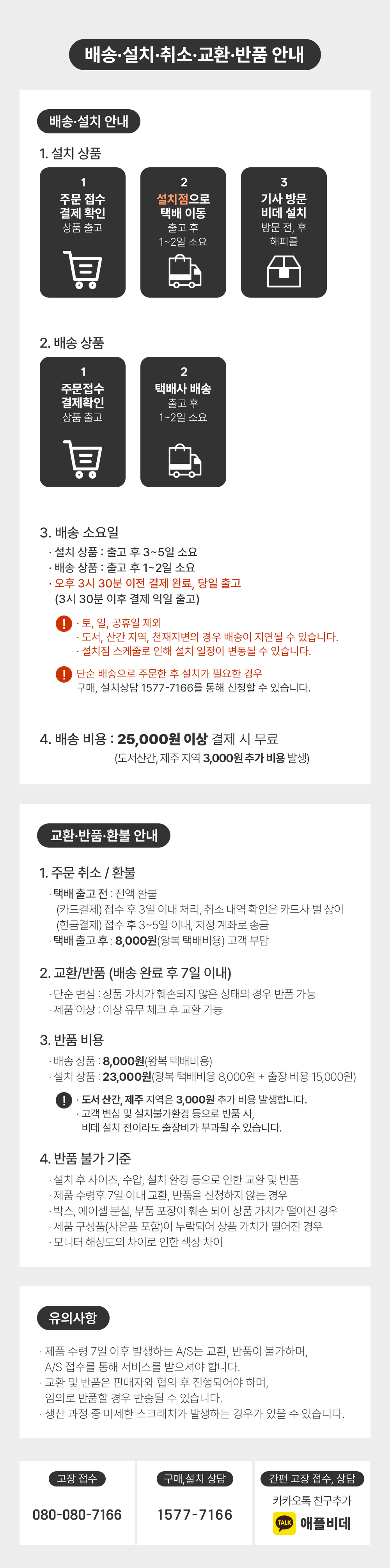 • ● 애플비데는 고객만족 서비스 제공을 위해 전문 기사님이 직접 방문하여 배송&설치를 진행합니다. (출고 후 3~5일 소요)
