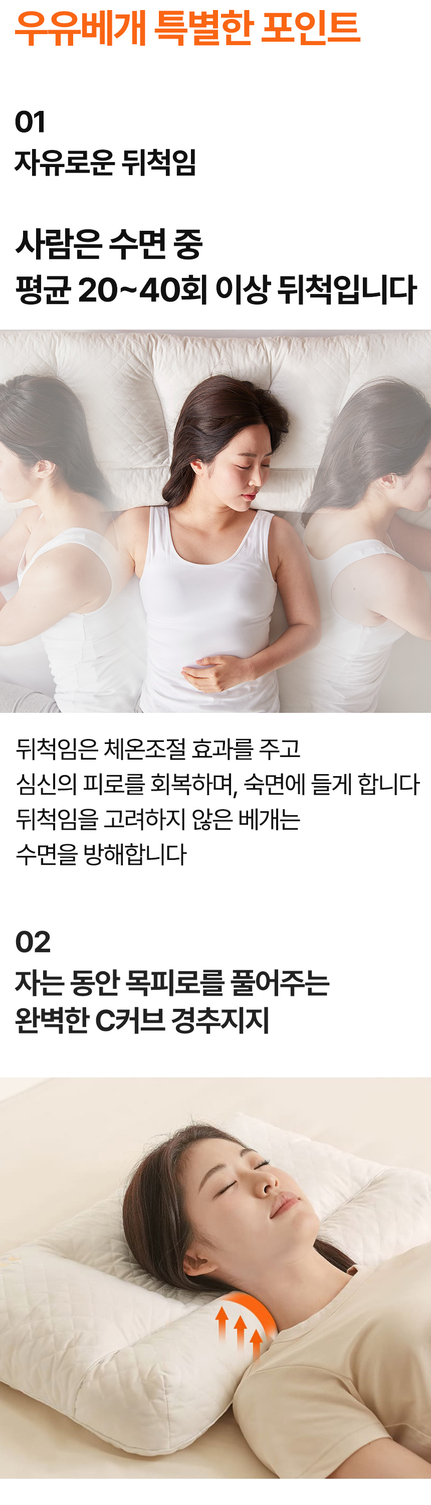 뒤척거릴 때 좋다는 거다. 사람을 잘 때 수십 번 뒤척거린다고 한다. 그럴 때 부자연스럽거나 걸리는 게 있다면, 잠이 깰 수 있는데, 우유베개는 뒤척임을 자연스럽게 받아준다고 한다.