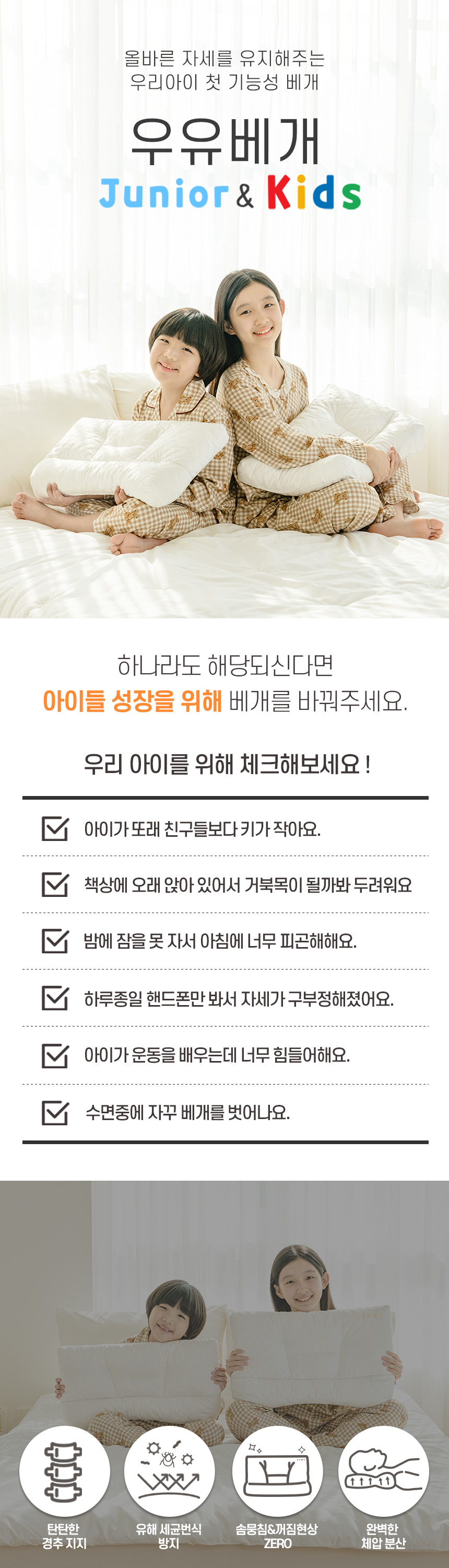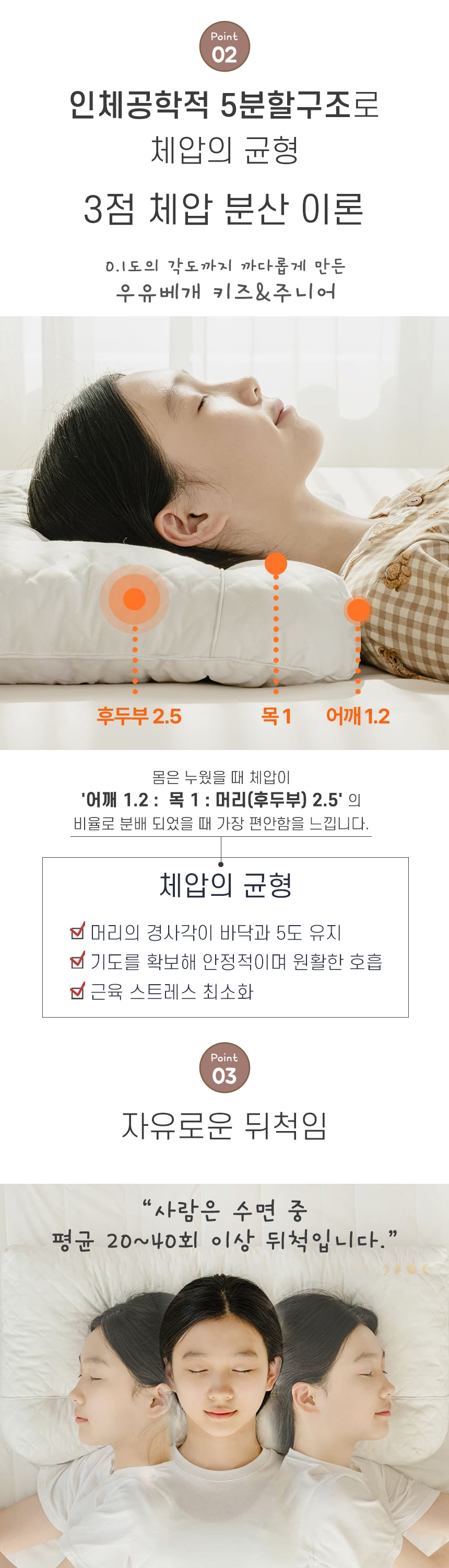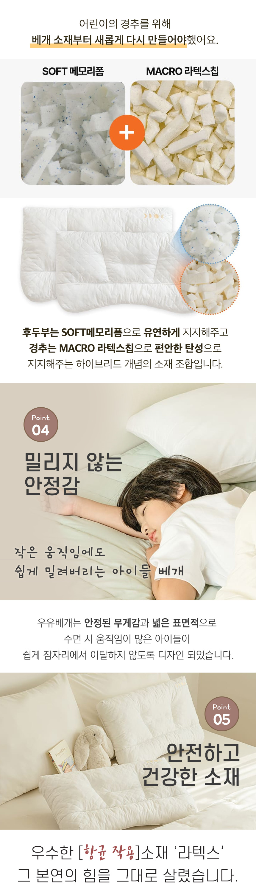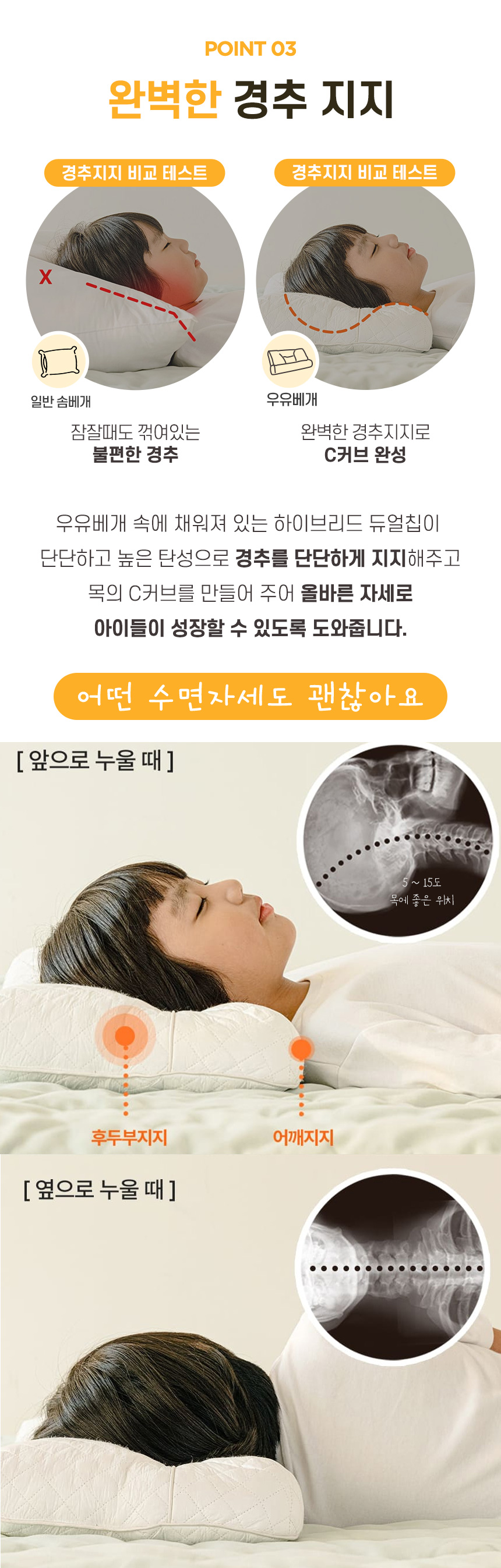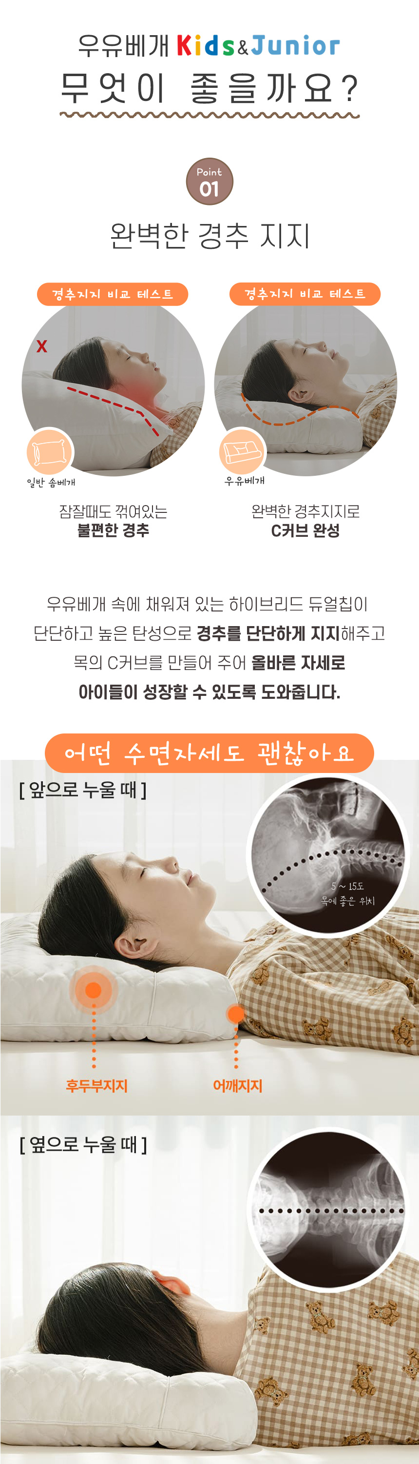 우유베개의 장점인 정자세, 옆으로 자는 자세 모두 커버 가능하기 때문에 자는 자세가 자주 바뀌는 아이에게도 좋을 베개라고 여겨진다.
