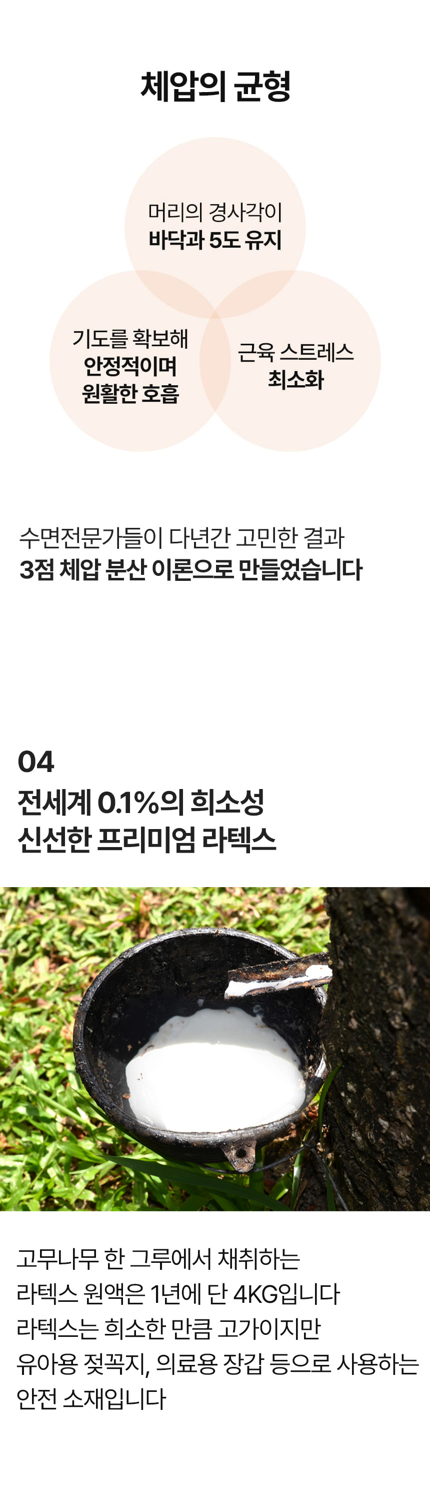 뉴 우유베개 라텍스보다 부드러운 경추지지를 해주는 베개는 뉴 우유베개 하이브리드다. 경추 부분을 일반 라텍스보다 조금 크게 조각낸 매크로 라텍스를 넣고 뒷머리인 후두부가 닿는 곳은 소프트 메모리폼 조각을 넣어 후두부도 부드럽게, 경추 지지도 조금 더 부드럽게 하였다.