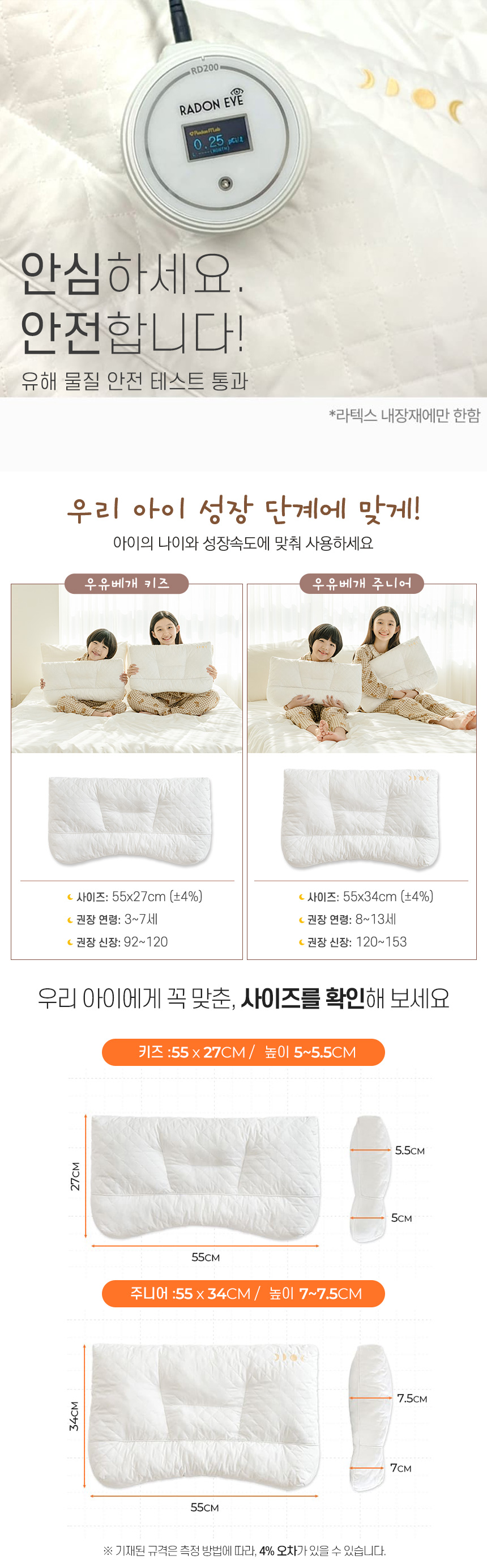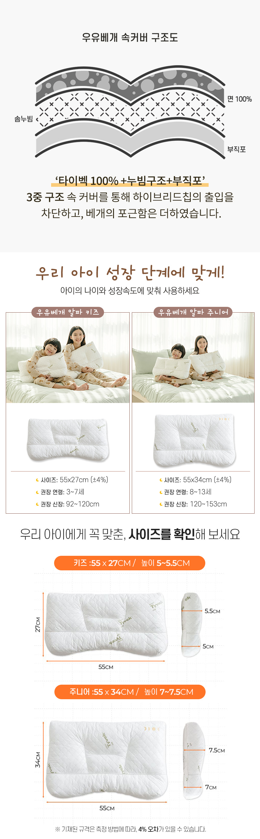 갓난 아기는 아가용이 따로 있고 그 다음에 쓰는 베개다. 본인이 생각했을 때 3살부터 쓸 수 있는 베개가 키즈, 7세부터 주니어를 추천하고 싶다. 물론, 아이 체형이나 신체 크기에 따라 다르니 스펙을 꼭 보고 사시는 게 좋다.