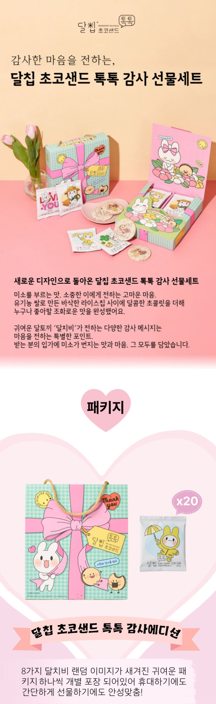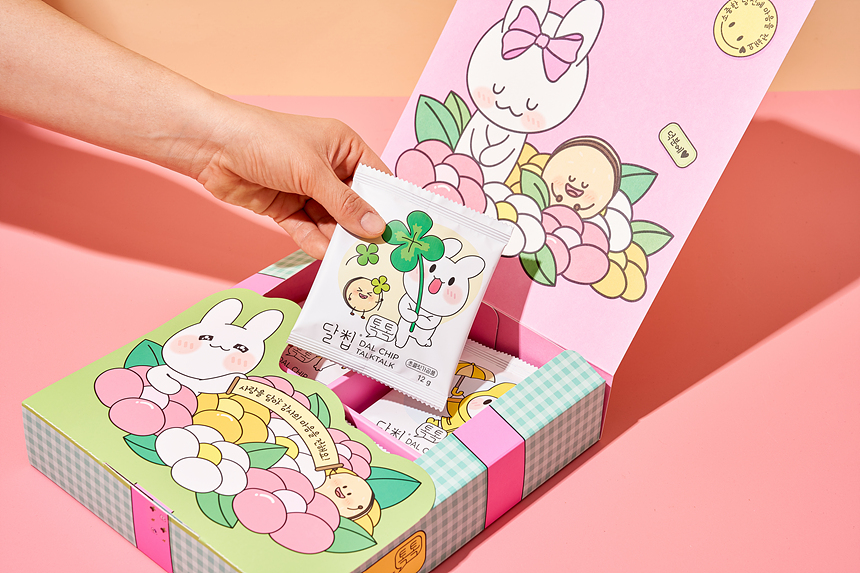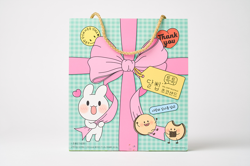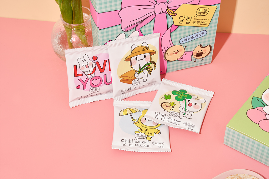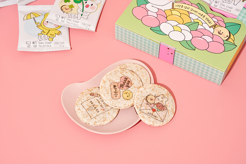 달칩 톡톡은 달칩 초코샌드/달칩 딸기샌드의 라이스칩에 푸드프린팅을 적용하여 콘텐츠를 입힌 특별한 간식입니다. 예쁘고 사랑스러운 달칩 톡톡 선물세트로 소중한 사람과 고마운분, 특별한 자신에게 마음을 전해보세요. |