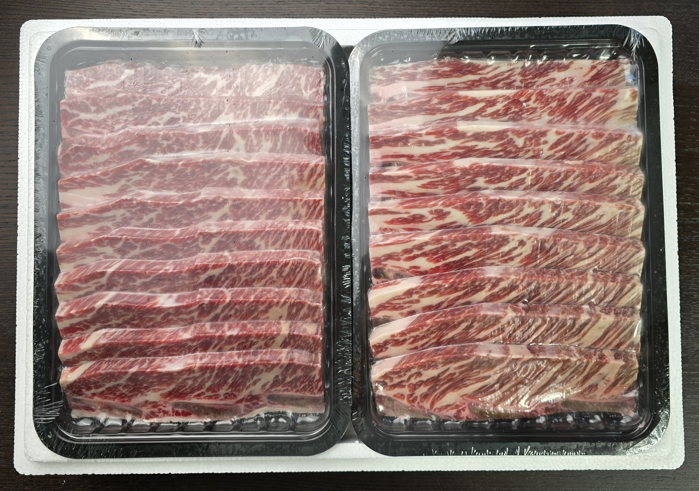 미국 공장에서 USDA의 깐깐한 관리하에 드라이에이징 가공이 완료되어, 냉동 진공포장된 후 항공으로 온 원육의 진공포장을 제거하는 모습, 드라이에이징 된 고기라 원육의 색이 일반 생고기와는 다르게 느껴진다.