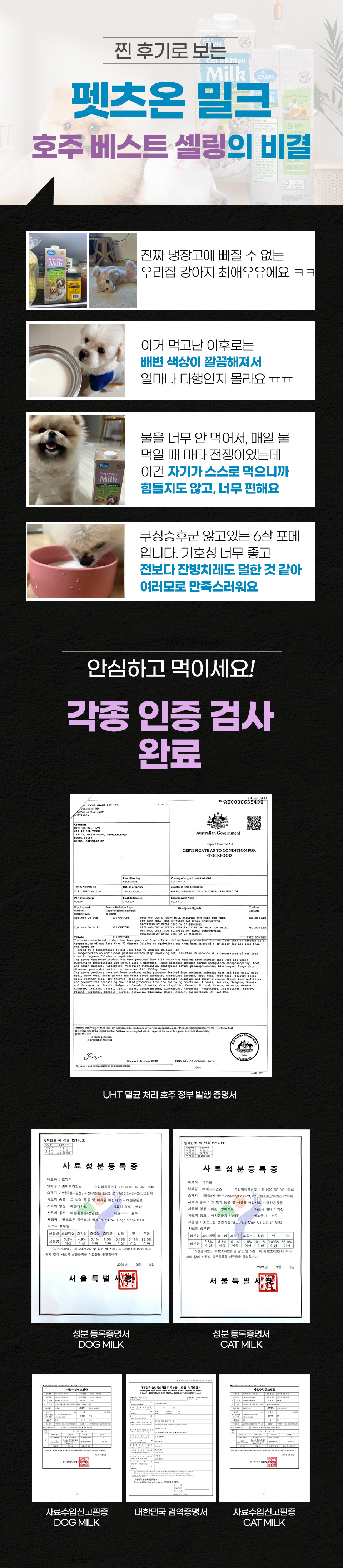 간식은 공식적인 기준이 없지만 사료의 경우 여러 평가 항목에 따라 등급을 나눌 수 있는데 이 항목에는 좋은 원료, 위생 관리, 사람도 먹을 수 있는지 등이 있다. 블랙독코리아 펫밀크의 경우 호주의 반려동물 건강기능식품 개발 제조사에서 좋은 원료로 위생적인 생산 과정을 거쳐 사람도 같이 먹을 수 있는 제품을 만들어냈다. 그러니 꽤 높은 등급의 우유라고 할 수 있다.