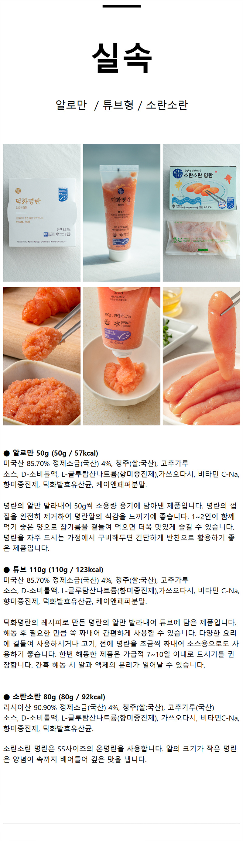 백명란은 소금으로만 절인 제품이고 그때 그대로 명란은 국내산 청주에 절인 명란, 숙성고에서 갓 꺼내먹는 명란은 제주 전통 어간장과 고춧가루를 이용해 김치처럼 무친 명란이다. 색소를 전혀 넣지 않고 만들기 때문에 색 차이는 양념의 차이라고 보시면 되겠다.