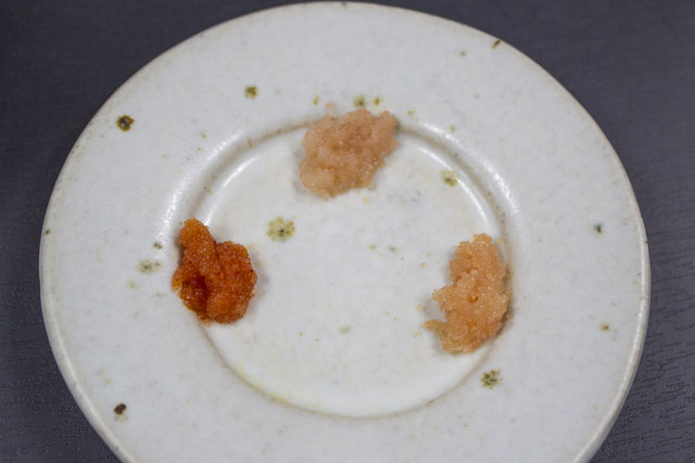 색이 연한 순서대로 백명란, 그때 그대로 명란, 숙성고에서 갓 꺼내먹는 명란이다.