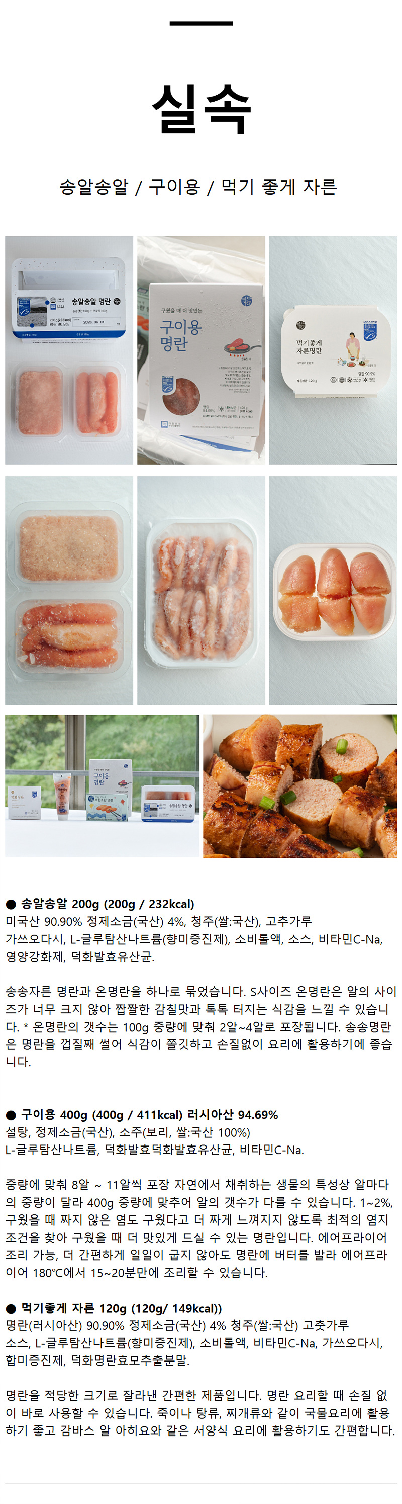 백명란은 소금으로만 절인 제품이고 그때 그대로 명란은 국내산 청주에 절인 명란, 숙성고에서 갓 꺼내먹는 명란은 제주 전통 어간장과 고춧가루를 이용해 김치처럼 무친 명란이다. 색소를 전혀 넣지 않고 만들기 때문에 색 차이는 양념의 차이라고 보시면 되겠다.