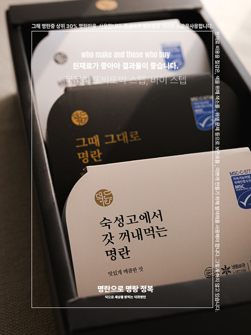 그렇게 사라질뻔 했던 우리의 명란을 다시 만들기 위해 노력했고 오랜 연구 끝에 결국 전통 방식 형태의 제품까지 만들어낸 곳이 바로 오늘 소개할 덕화명란이다.