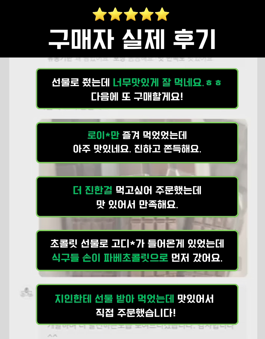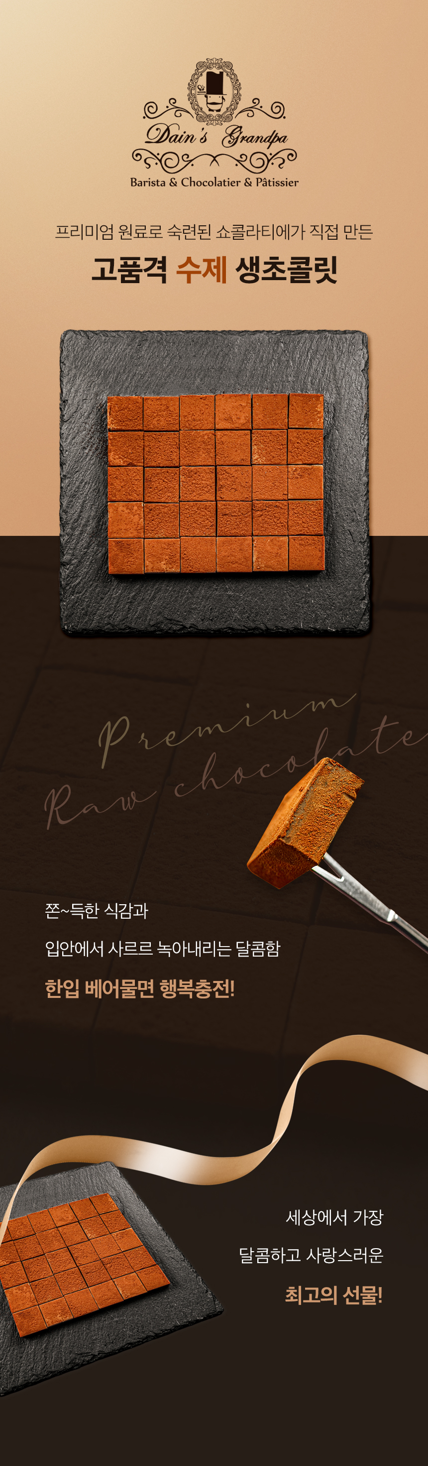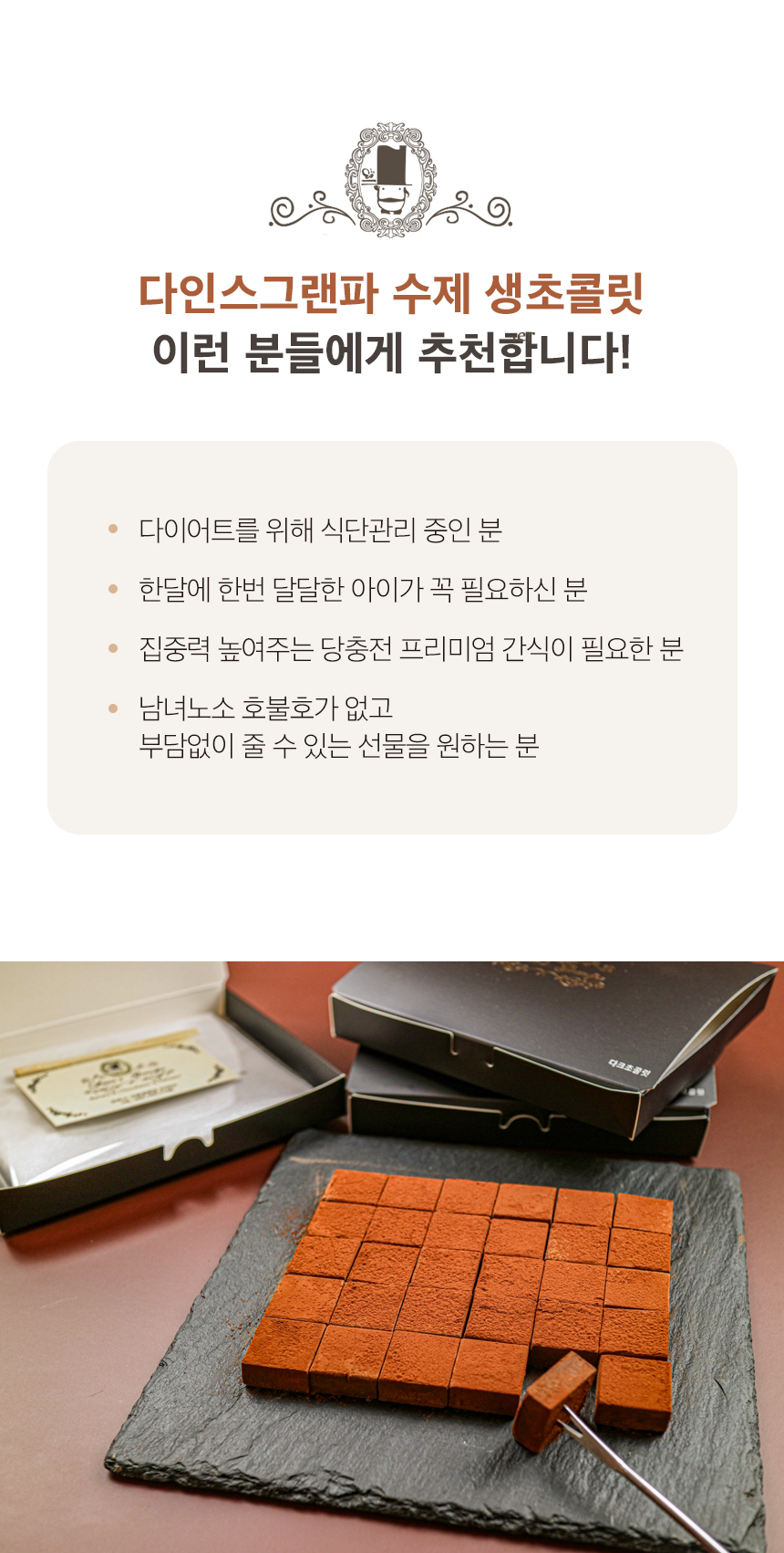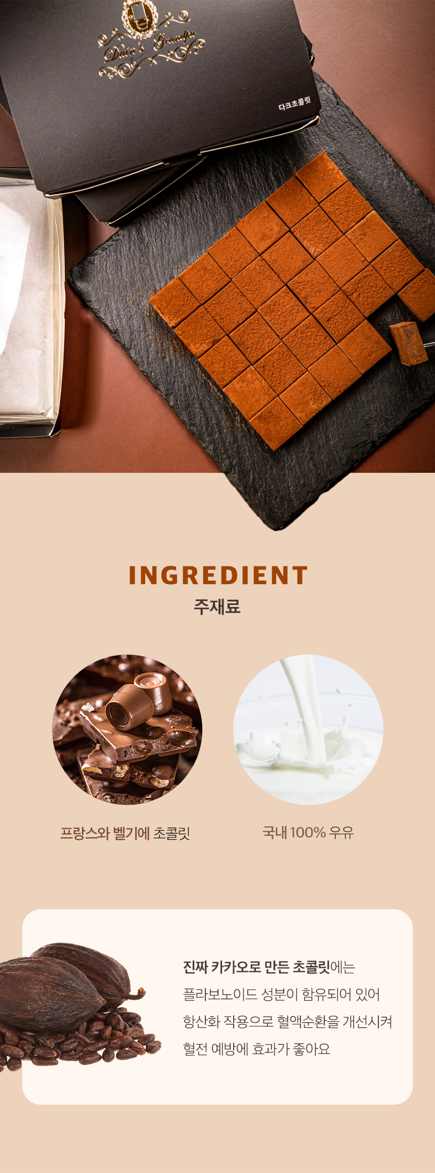 고급 카카오로 만든 초콜릿에 국내산 100% 우유 생크림을 넣어 말랑말랑하고, 냉장고에서 꺼내자마자 먹을 땐 쫀득하다. 입에 넣으면 사르르 녹으면서 카카오의 달콤함이 퍼진다. 초콜릿이 사라질 때 혀에 머물던 초콜릿의 지방기와 단맛도 사라진다. 입을 헹구지 않아도 방금 전에 먹은 초콜릿의 흔적을 느끼지 못할 정도로 깔끔한 맛이다.