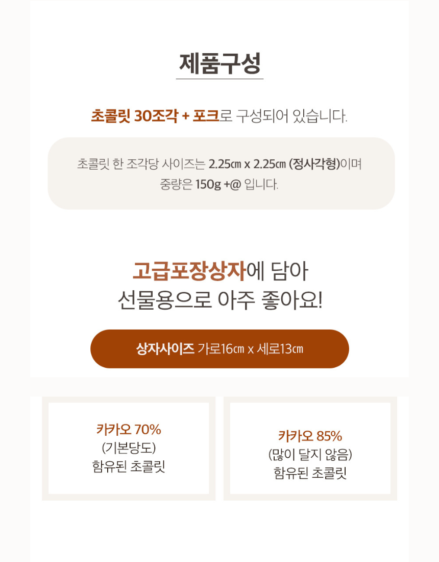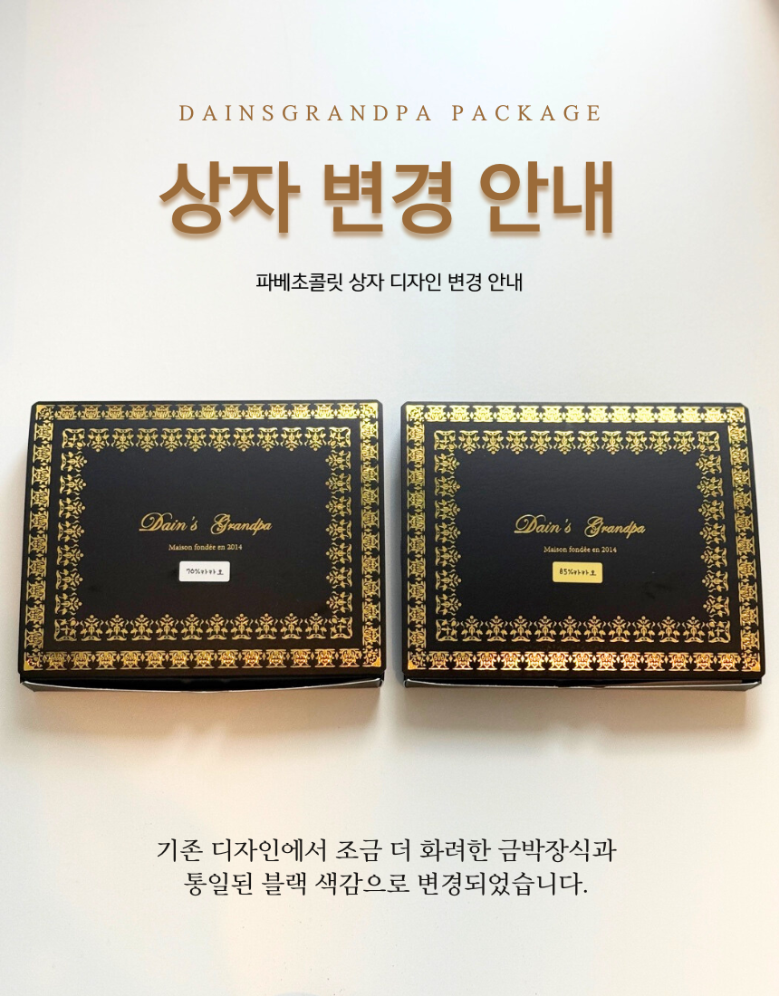 일반적으로 55~75% 카카오 함량이면 누구든 호불호 없이 먹을 수 있다고 한다. 적당히 달콤한 초콜릿을 찾는 고객을 위해 70% 다크초콜릿을 만들고, 그보다 업그레이드된 진함을 찾는 고객을 위해 85% 다크초콜릿도 준비했다.