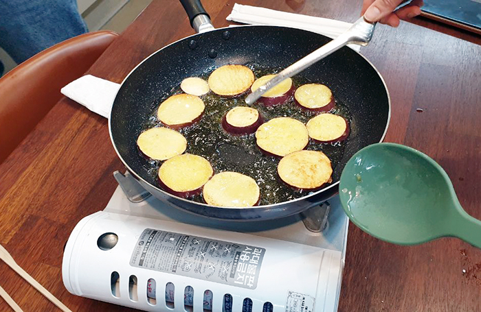 고구마는 쪄 먹어야 제맛이라지만 고구마튀김 느낌으로 기름을 둘러 튀기 듯 구워 먹어보았다.