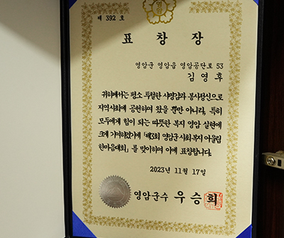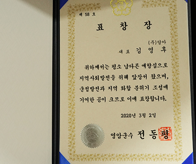 일자리 우수기업 인증서, 표창장, 감사패 등 지역사회 발전에도 힘을 쏟고 있는 내역도 검증 완료.