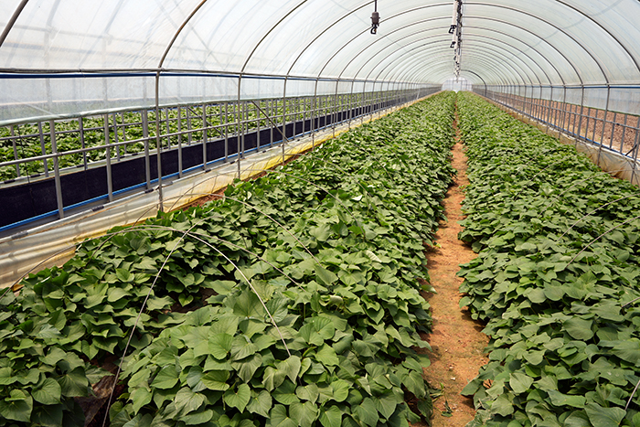 비닐하우스에 씨고구마를 심어 싹을 틔운 후