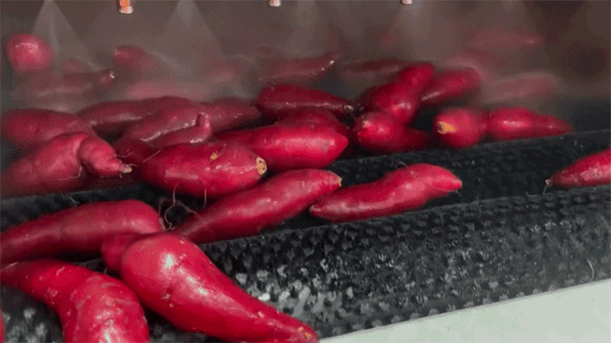불량 고구마들을 선별하여 걸러내고 상(上)품들은 깨끗하게 다시 태어나기 위해 세척기로 이동된다.