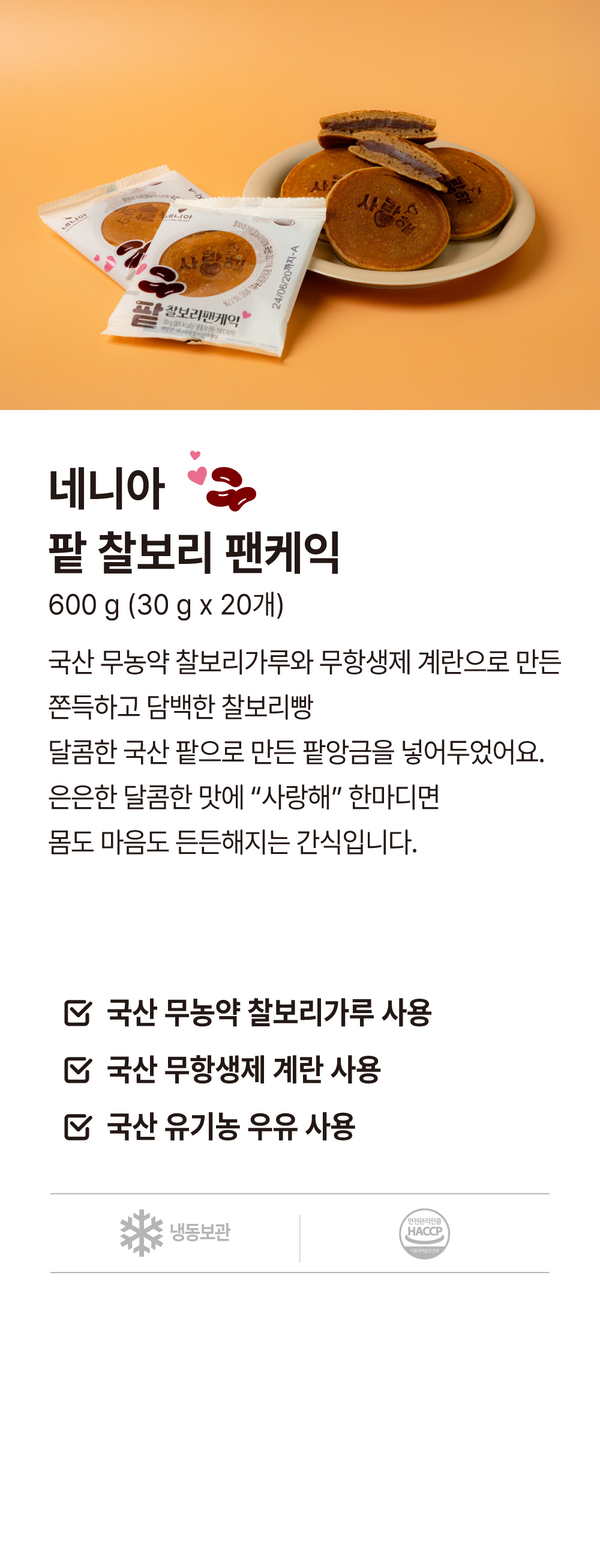 제품설명 무농약 우리밀과 국내산 천연 버터로 만든 네니아 사랑해 팥 찰보리 펜케익
