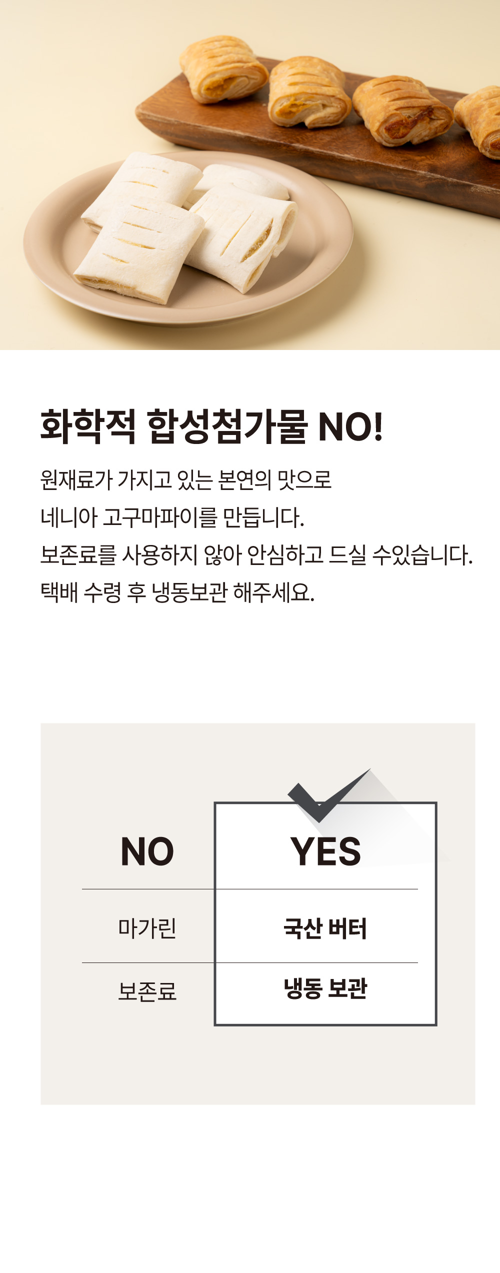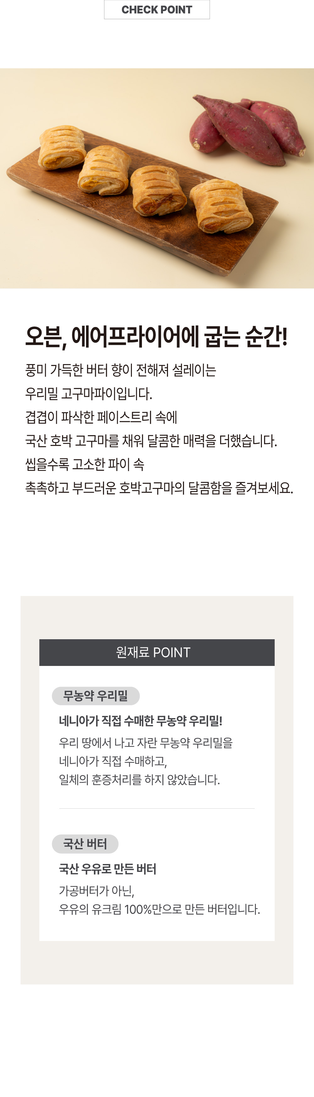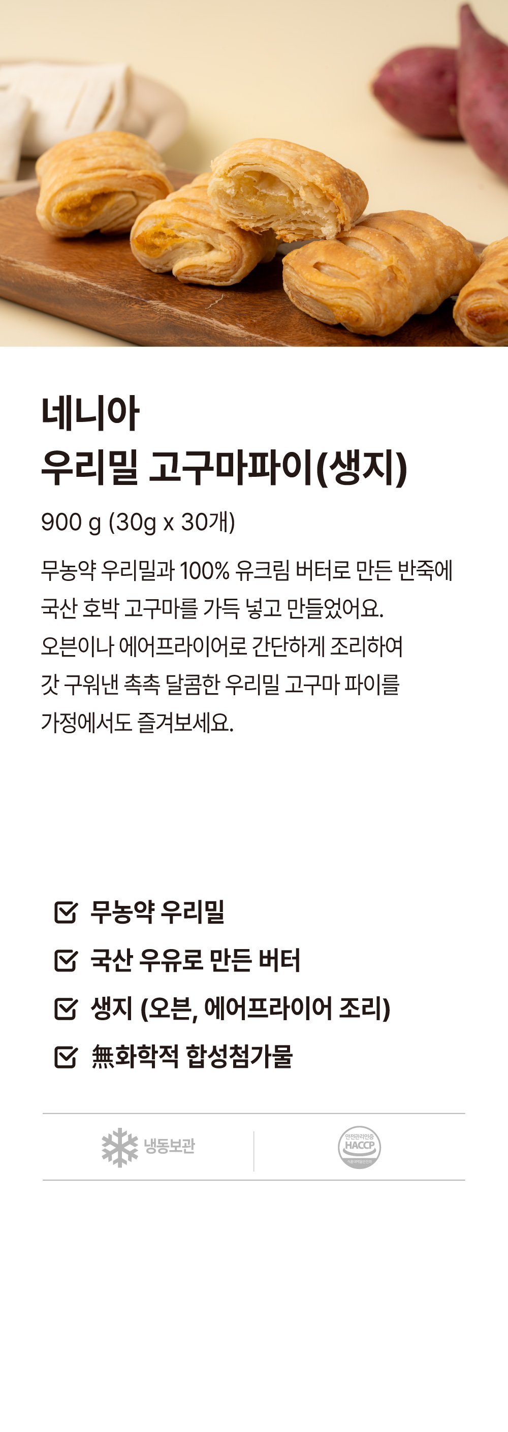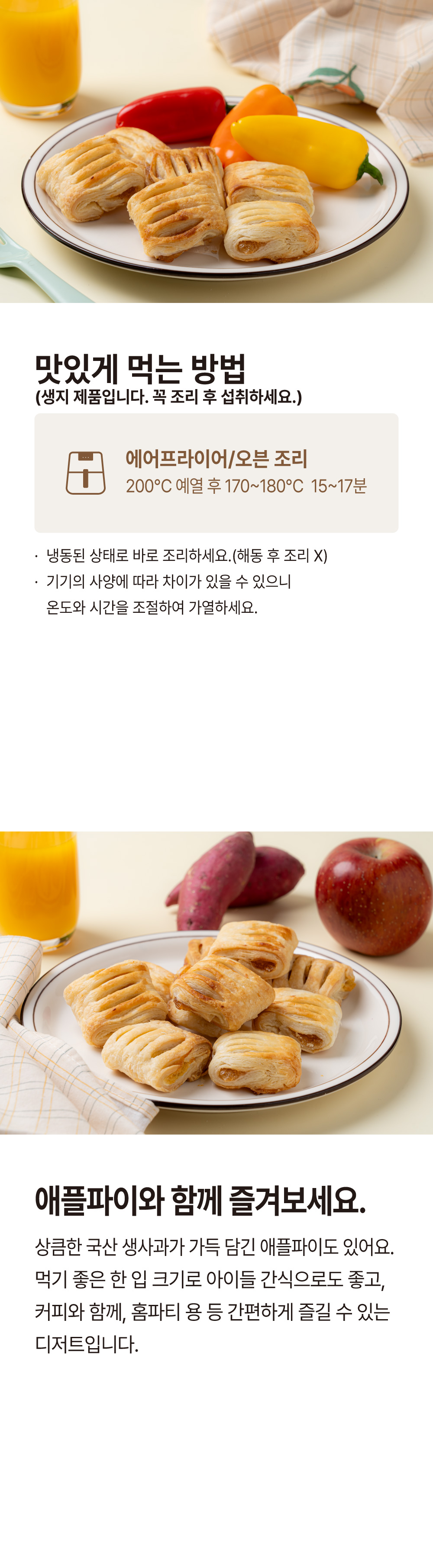 고구마 파이는 반죽을 급속 냉동시켜 집에서 구워 먹을 수 있게 나온 제품이다. 금방 구워 따뜻하고 바삭한 파이를 집에서 차와 함께 즐겨보자. 참고로 고구마 파이는 해동하지 않고 냉동 상태 그대로 오븐이나 에어 프라이기에 넣어 조리해야 한다.