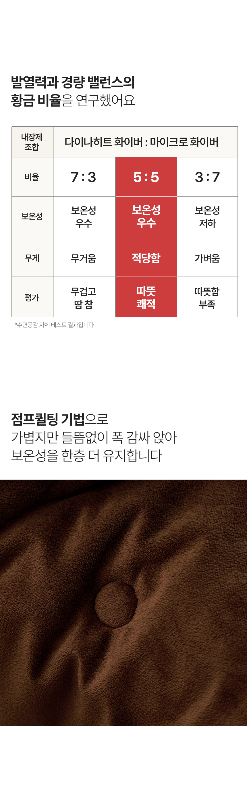 체열을 흡수하여 원적외선 형태로 재방출하는 신소재를 사용하여 얇으면서도 확실한 보온력을 갖췄다.