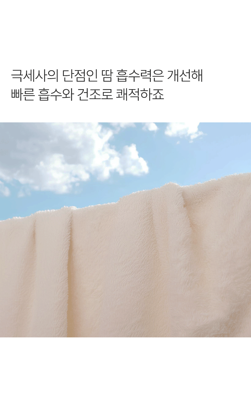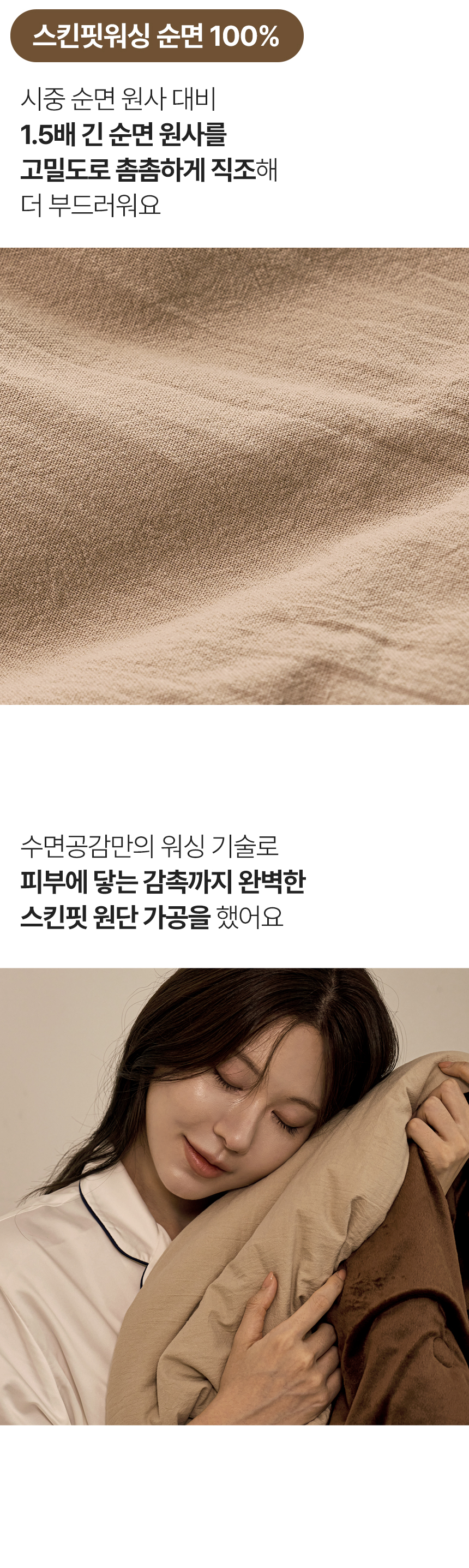 순면은 시중 원사 대비 1.5배 긴 원사를 고밀도로 직조했다고 하며, 스킨핏워싱 공정으로 피부에 닿는 느낌을 개선했다. 극세사는 1mm 두께의 얇은 프리미엄 극세사를 사용했다. 1mm 극세사는 두께가 얇아 답답하게 느껴지지 않았다.