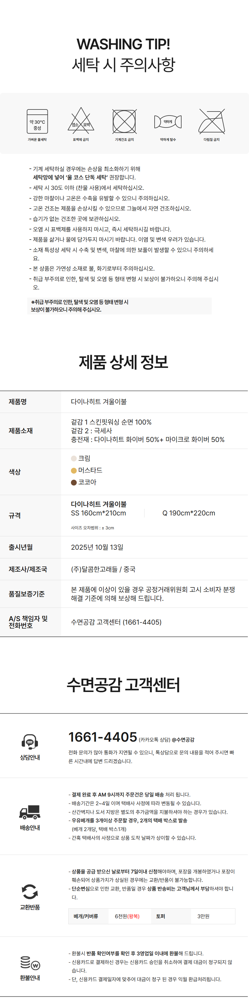 수면공감 다이나히트 겨울 이불은 물세탁이 가능하다. 단, 찬물에 울 코스를 추천한다. 뜨거운 물로 세탁하면 면 소재 특성상 줄어들 가능성이 있다.