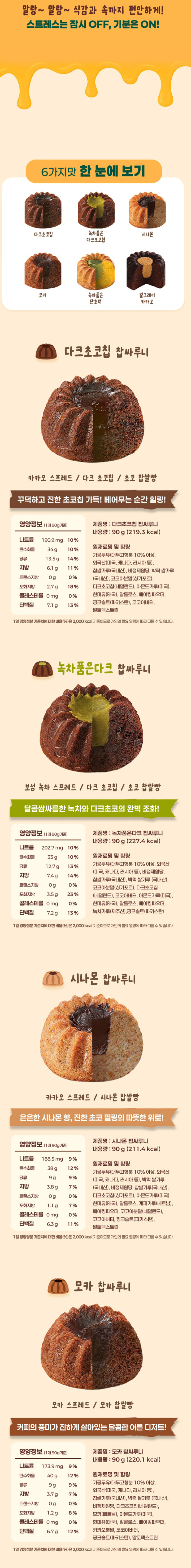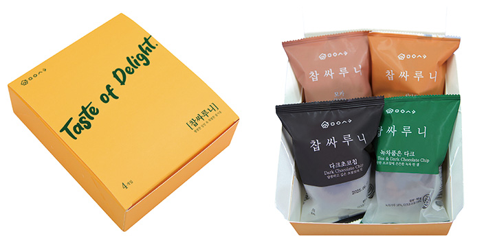 한 상자에는 네 개의 찹싸루니가 담긴다. 각 맛을 모두 경험해보고 싶다면 다크초코칩, 시나몬, 모카, 녹차품은다크가 한 개씩 들어 있는 '맛별로 1개씩 세트' 옵션을 추천드린다.