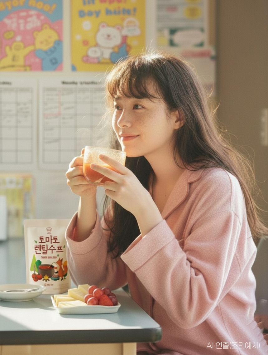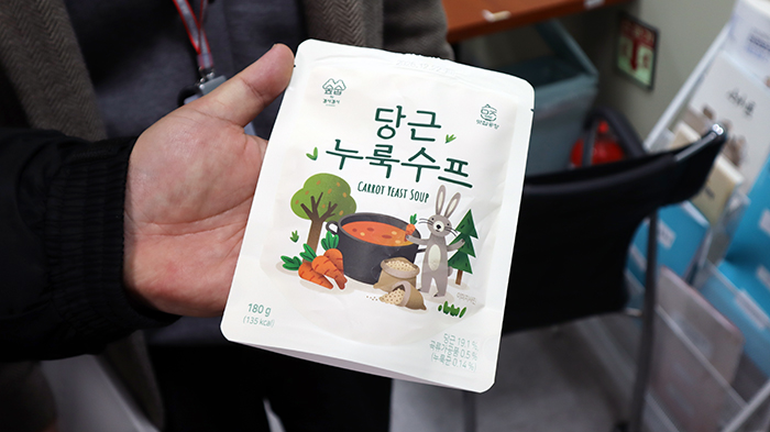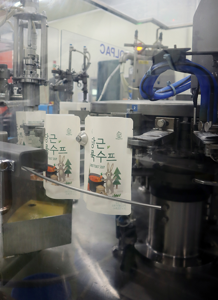 귀여운 일러스트가 돋보이는 제품 파우치에 최종 테스트를 거쳐 합격된 수프 원물 충진 작업을 진행