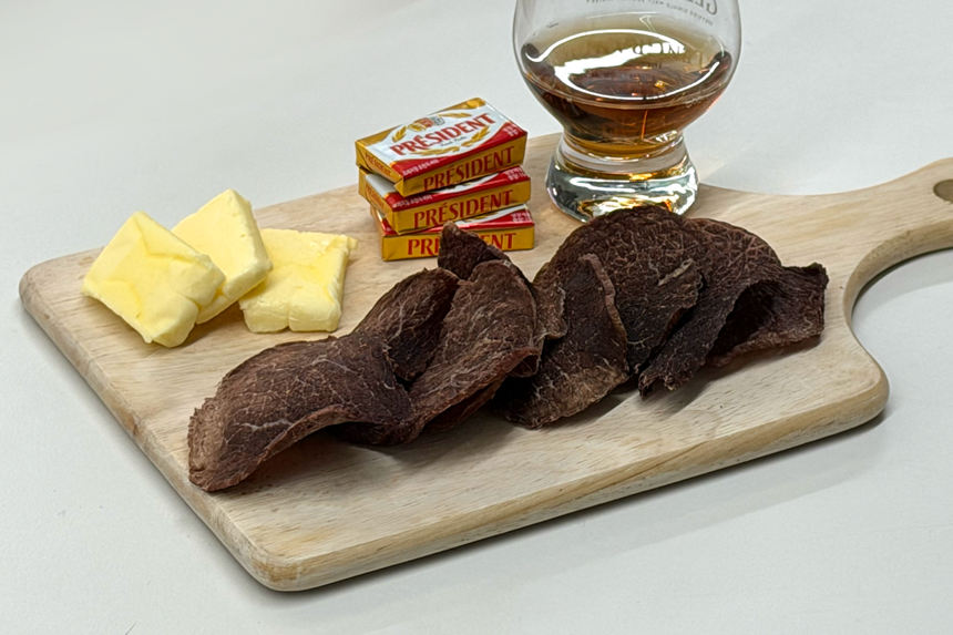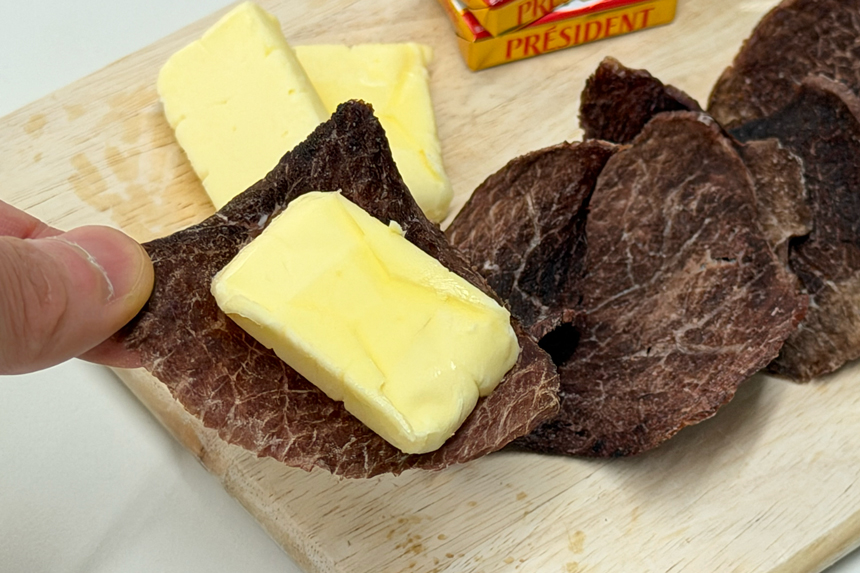 조미료에 절여진 우리 입맛에는 소고기 과자 빕빕칩이 낯설게 느껴질 수 있다. 이럴 때 빕빕칩에 버터를 올려 먹어보자. 맛있다.
