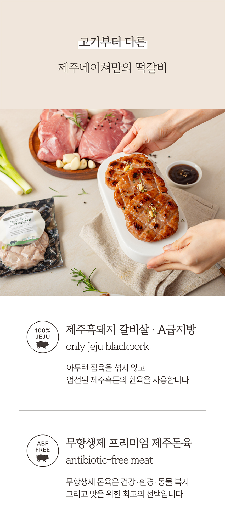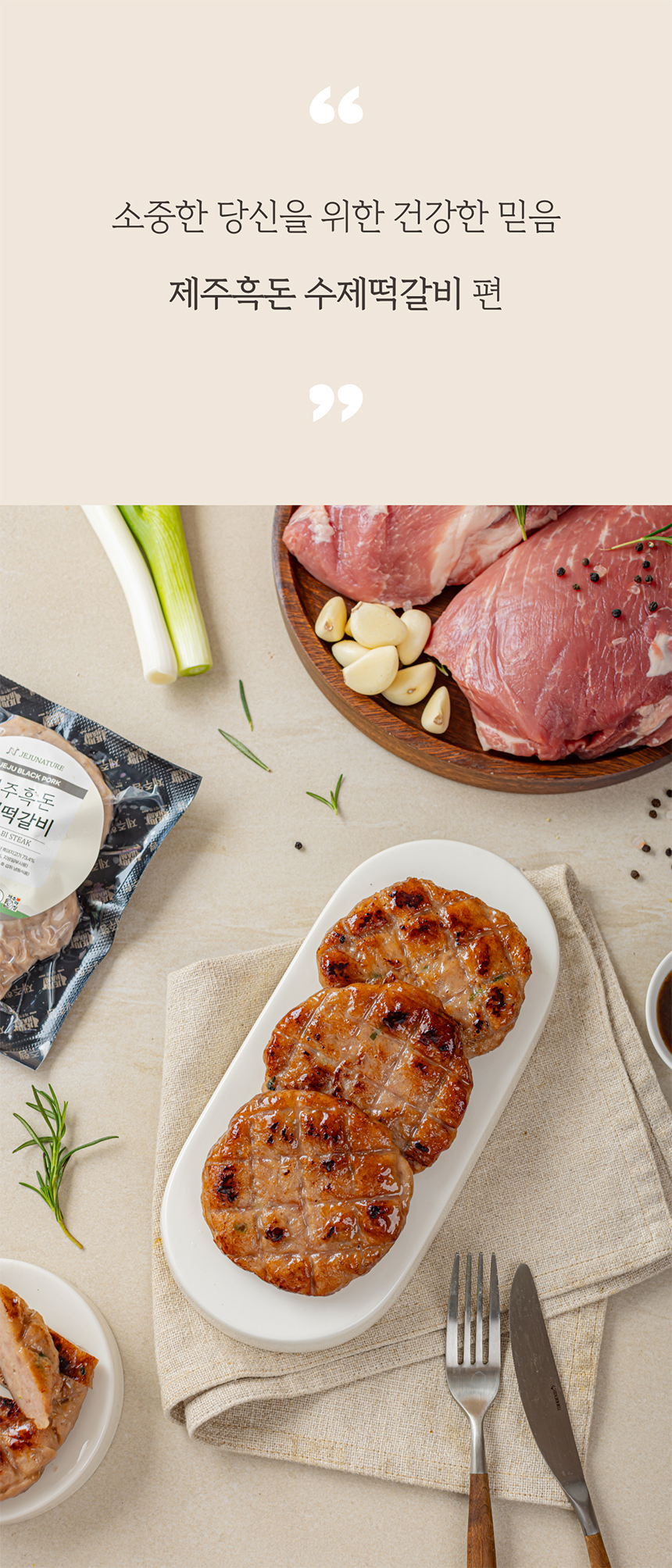 제주흑돈 소시지와 떡갈비는 발골 후 남은 고기를 사용하는것이 아니라 제주산 흑돼지의 뒷다리로만 만들고 있다. 뒷다리가 비교적 지방이 적어 퍽퍽하지 않을까라고 생각될 수 있지만 A등급의 지방을 함께 넣고 다져내기 때문에 살코기의 담백함과 지방의 고소함을 맛볼 수 있다.