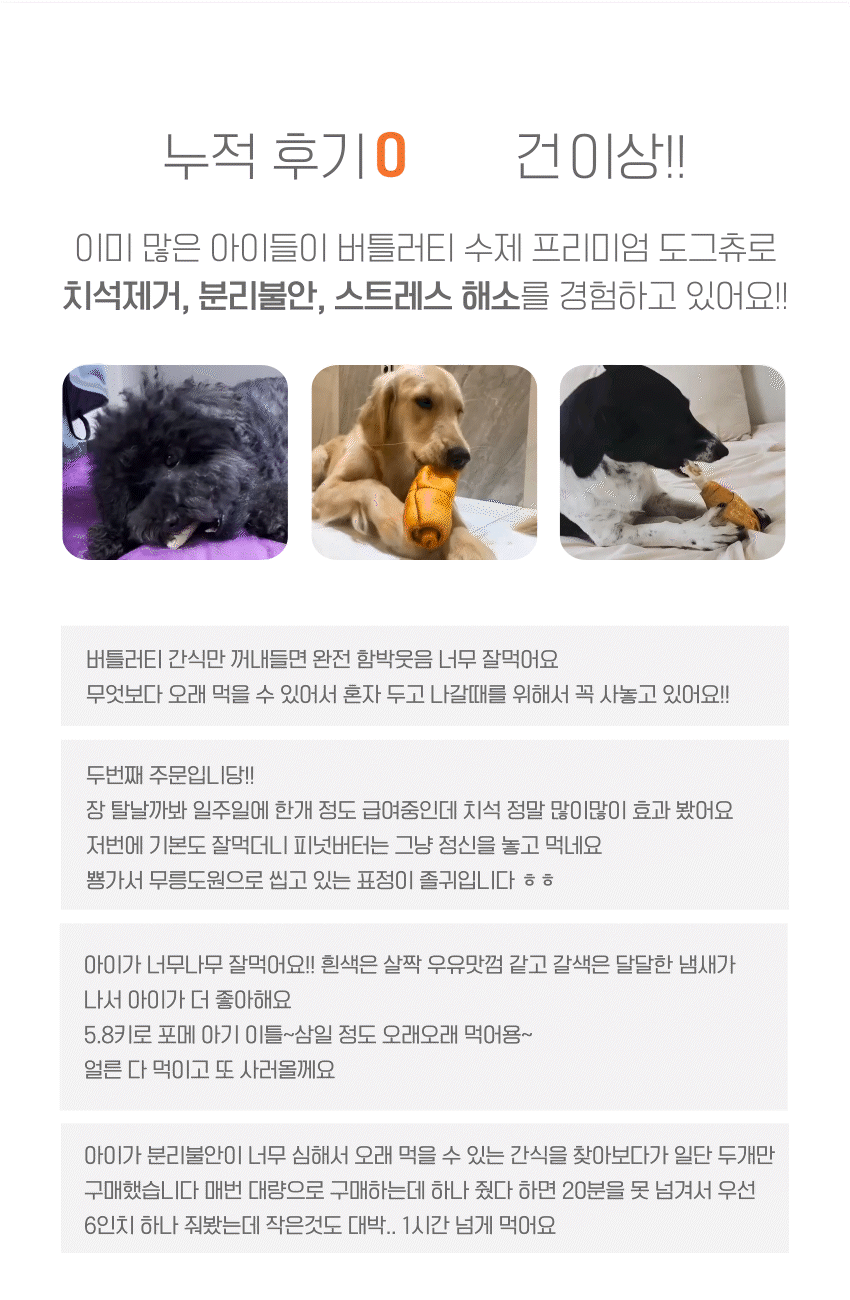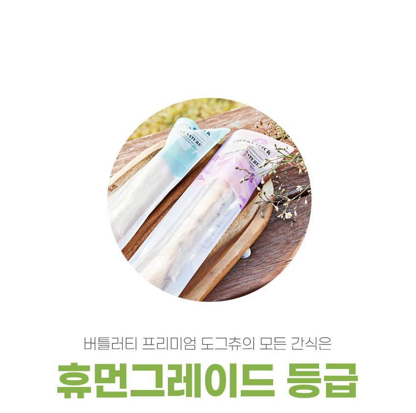거기다 근본적으로 개들은 무언가를 씹는 행위를 통해 스트레스 해소, 턱근육 발달, 두뇌 자극 등의 효과를 얻을 수 있고, 질긴 껌을 씹는 과정에서 치아에 붙어있는 치석도 제거된다. 버틀러티 제품은 원물을 그대로를 사용해 거친 표면이 특징인데 이는 치석제거에 특히나 좋다.