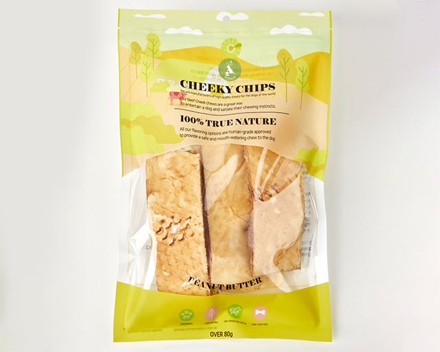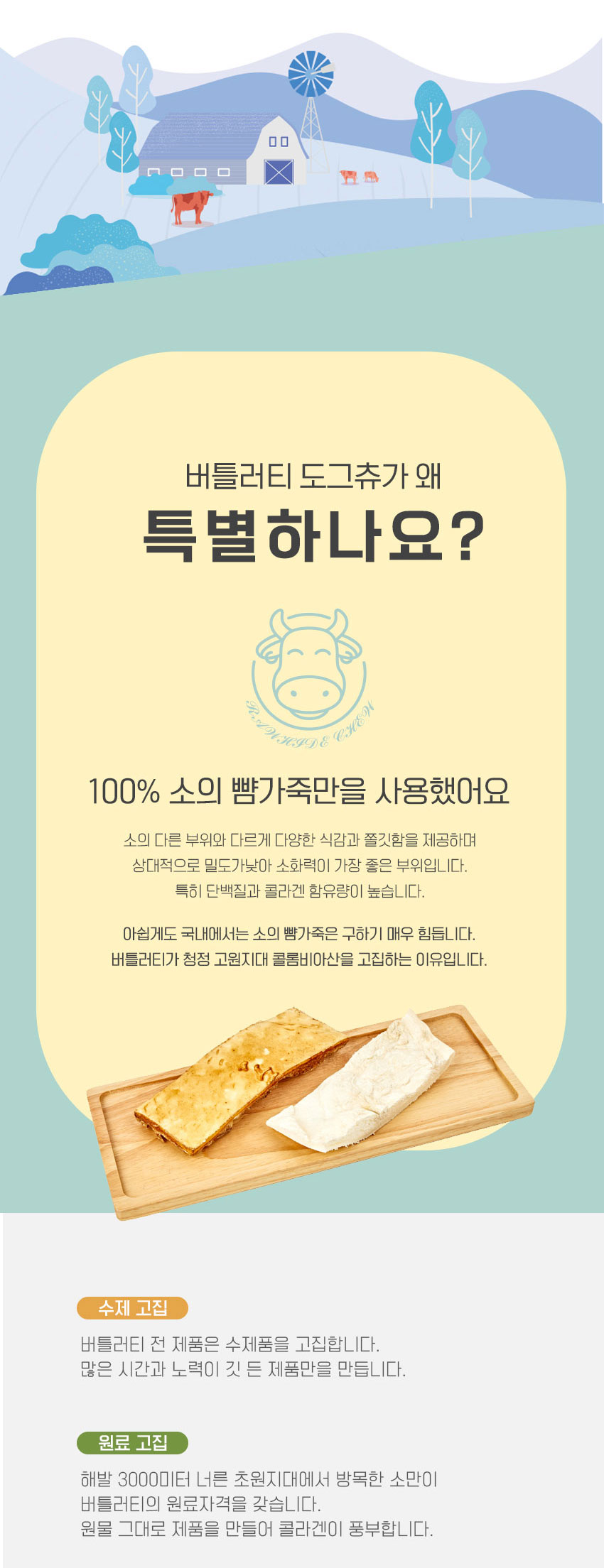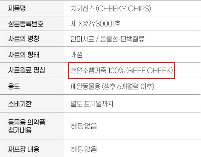 소 뺨가죽은 다른 부위에 비해 콜라겐 함량이 많아 쫄깃하면서도 부드러운 식감을 가지고 있다. 단일 원료 사용으로 소화에도 장점이 있다.
