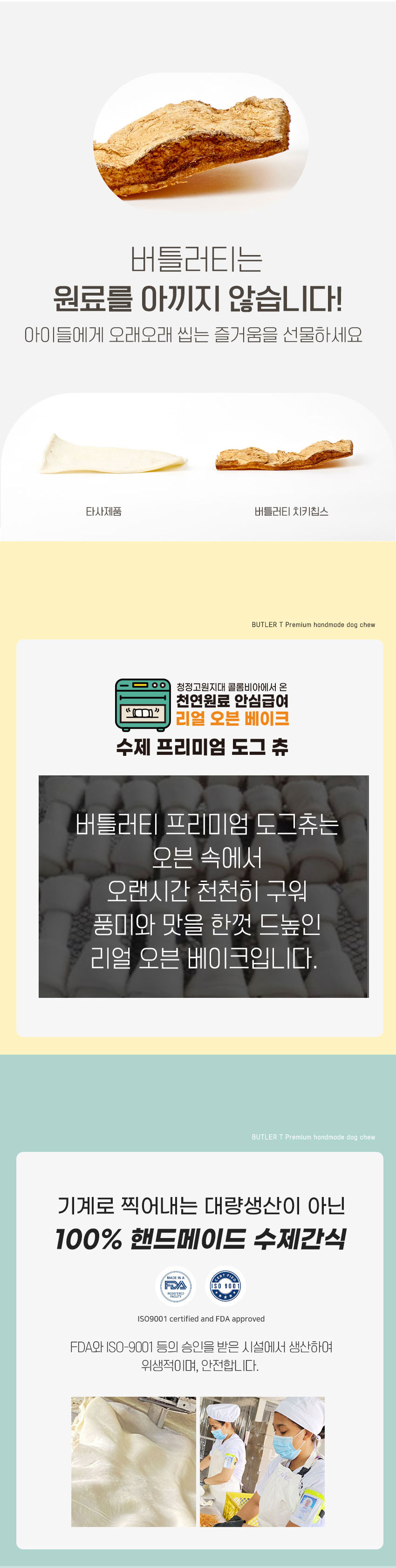 원물을 개껌으로 이용할 수 있도록 1차로 모양을 잡고 건조한 후 저온 오븐에서 한번, 고온 오븐에서 한번 구워 맛과 향을 극대화했다. 때문에 미세 그릴 자국이 있을 수 있다.