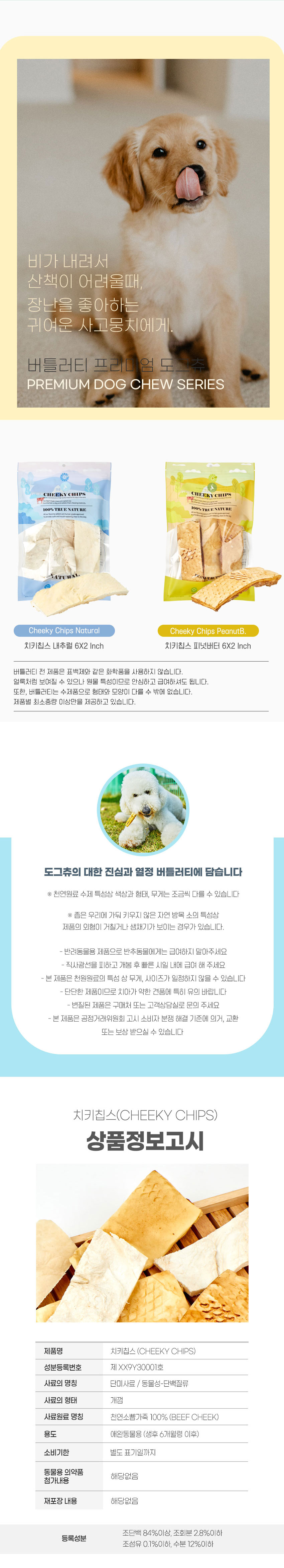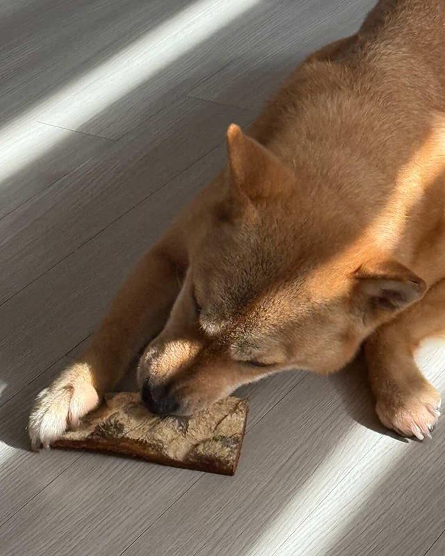 화학품을 사용하지 않아 자연 그대로의 향취를 머금고 있어 개들의 선호도도 높은 편이라고 한다. 원물 그대로의 형태로 제조하기 때문에 두께가 일정하지 않은데 강아지에게는 다양한 씹는 맛을 느끼게 해 장점으로 작용한다.