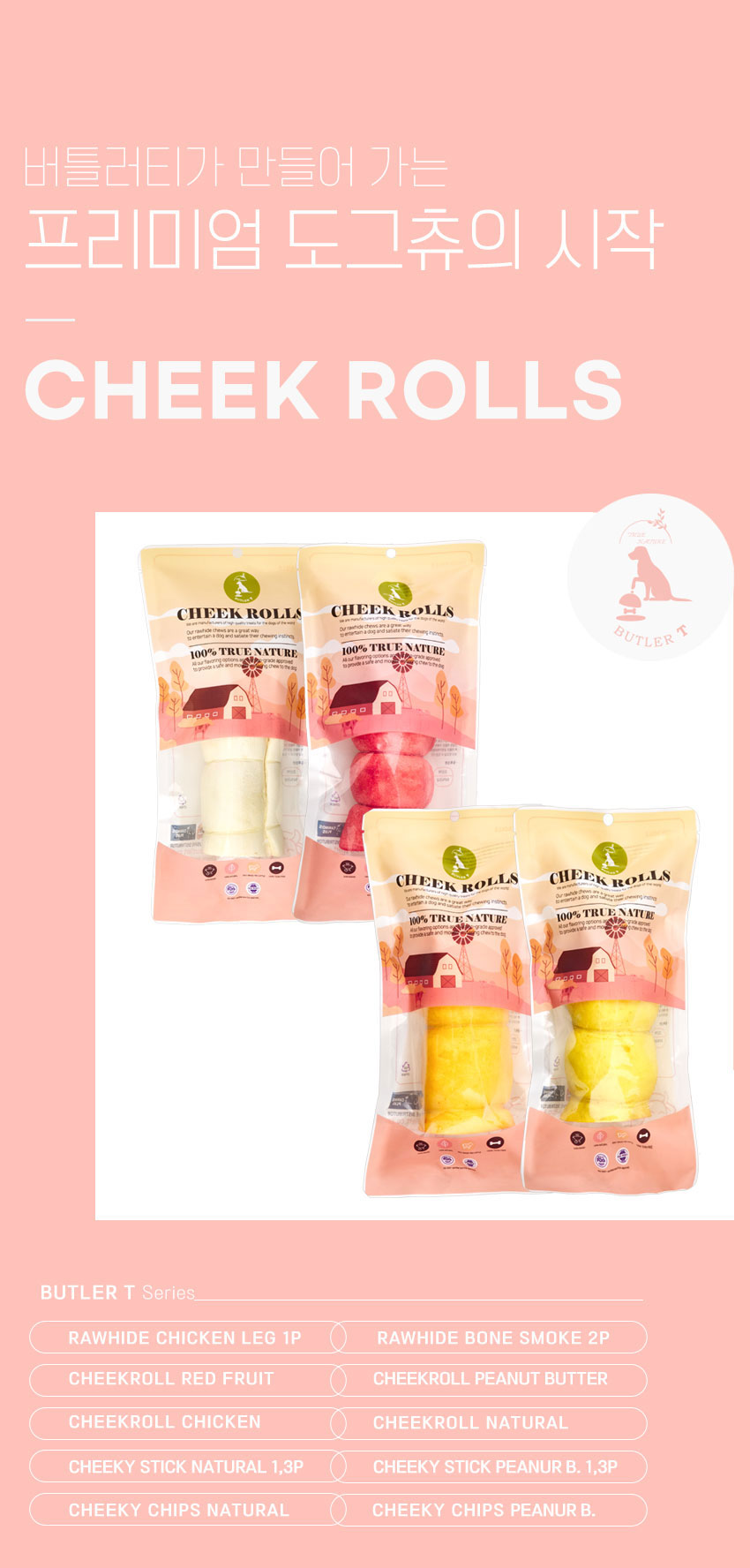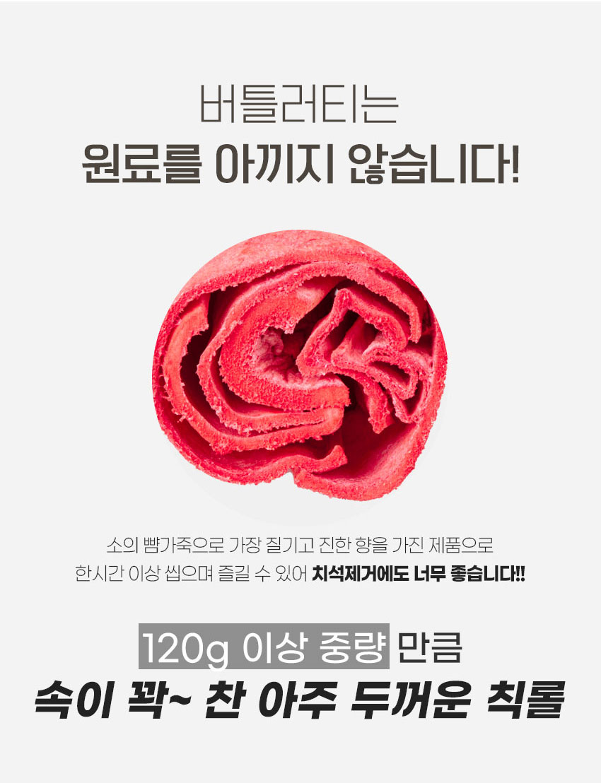 거기다 근본적으로 개들은 무언가를 씹는 행위를 통해 스트레스 해소, 턱근육 발달, 두뇌 자극 등의 효과를 얻을 수 있고, 질긴 껌을 씹는 과정에서 치아에 붙어있는 치석도 제거된다. 버틀러티 제품은 원물을 그대로를 사용해 거친 표면이 특징인데 이는 치석제거에 특히나 좋다.