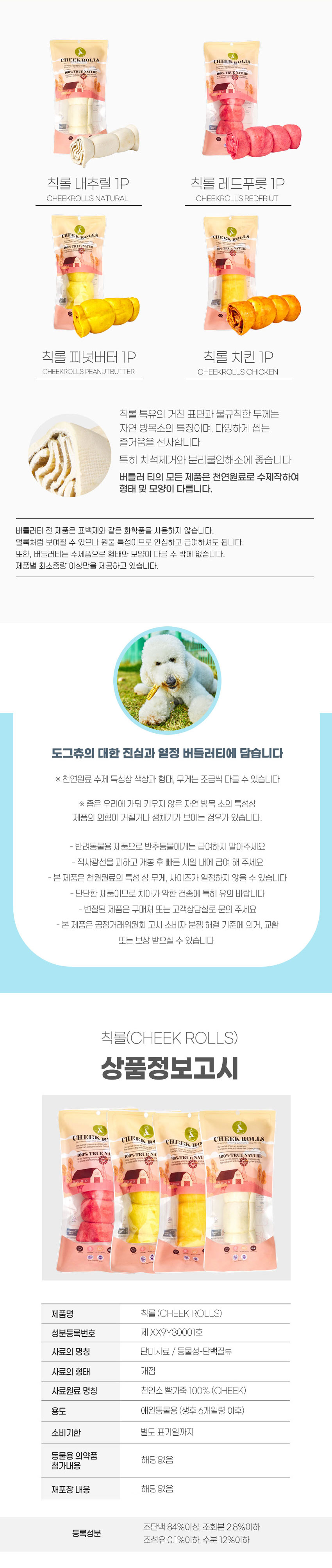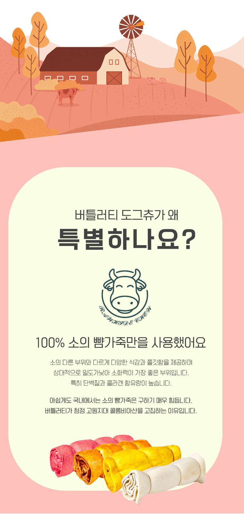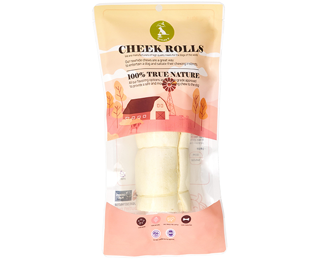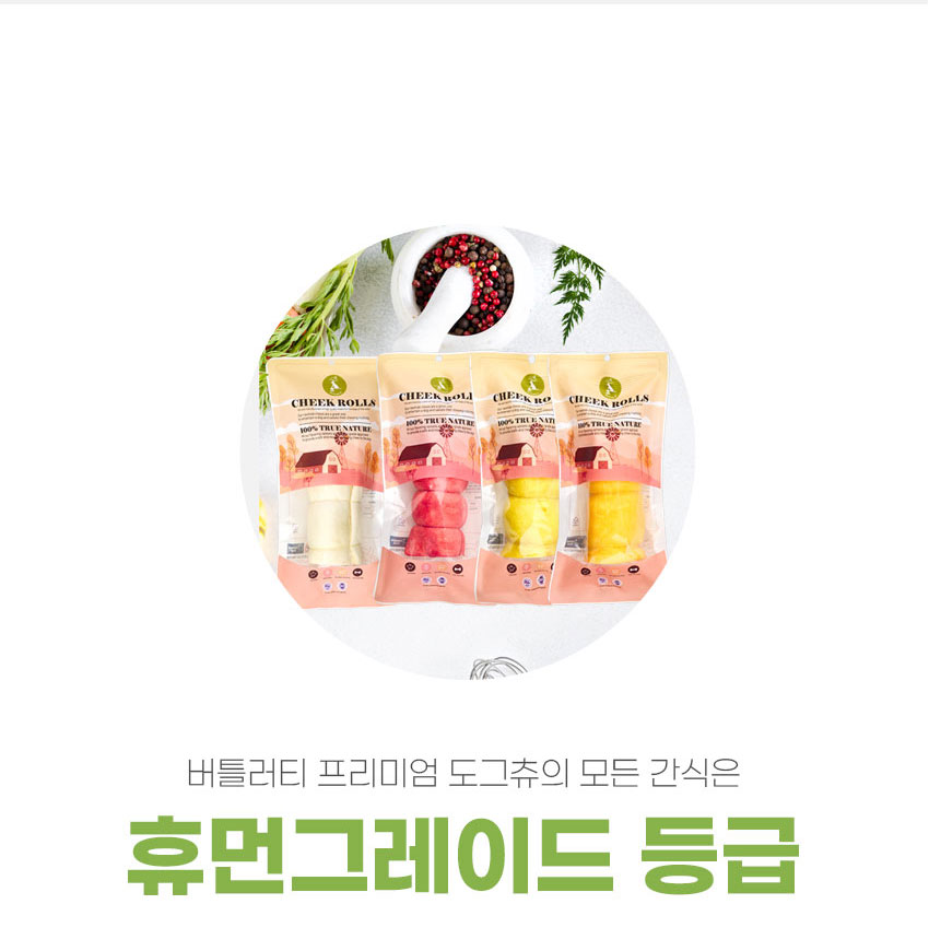 소 뺨가죽은 다른 부위에 비해 콜라겐 함량이 많아 쫄깃하면서도 부드러운 식감을 가지고 있다. 단일 원료 사용으로 소화에도 장점이 있다.