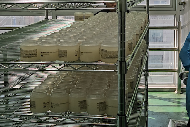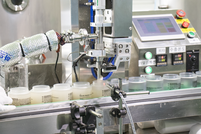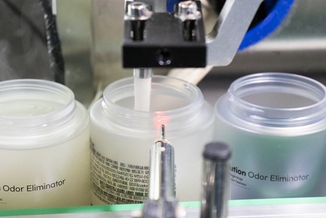 정면에 보이는 두꺼운 원통은 일정한 온도를 유지하는 기능이 있어 원료가 굳지 않게 하고, 안에 프로펠러 모양의 기구가 돌아가며 뭉치는 것을 방지한다. 기계 한 대 당 약 4,000개 분량의 탈취제 생산이 가능하다.