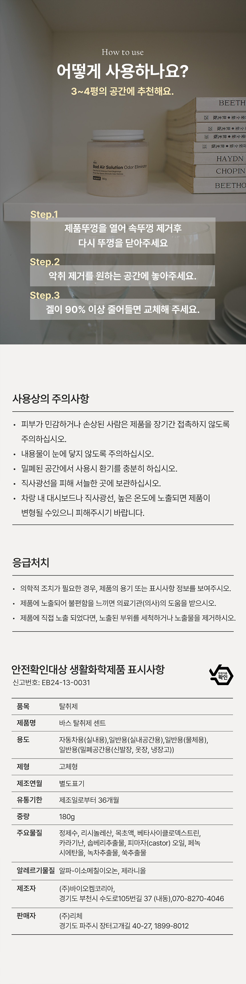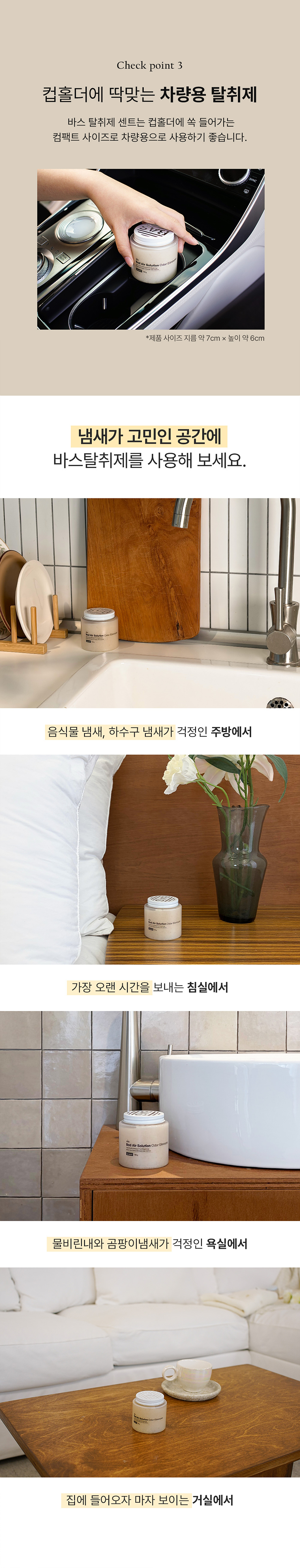 차 안이나 옷장 같은 작은 실내 공간에서의 사용을 추천드리고 일반적인 화장실 정도의 공간에서도 사용할 수 있다.
