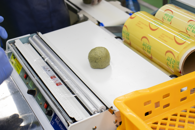 나온 떡을 랩으로 싸면 생산하는 과정은 끝이다.