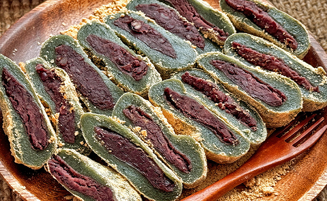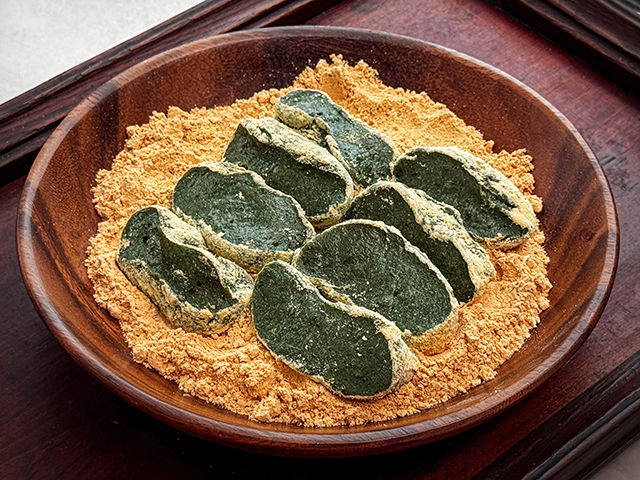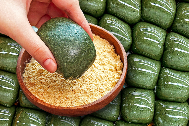 콩쑥개떡은 콩가루를 묻힌 떡으로 콩가루와 쑥 향이 잘 어우러진다.